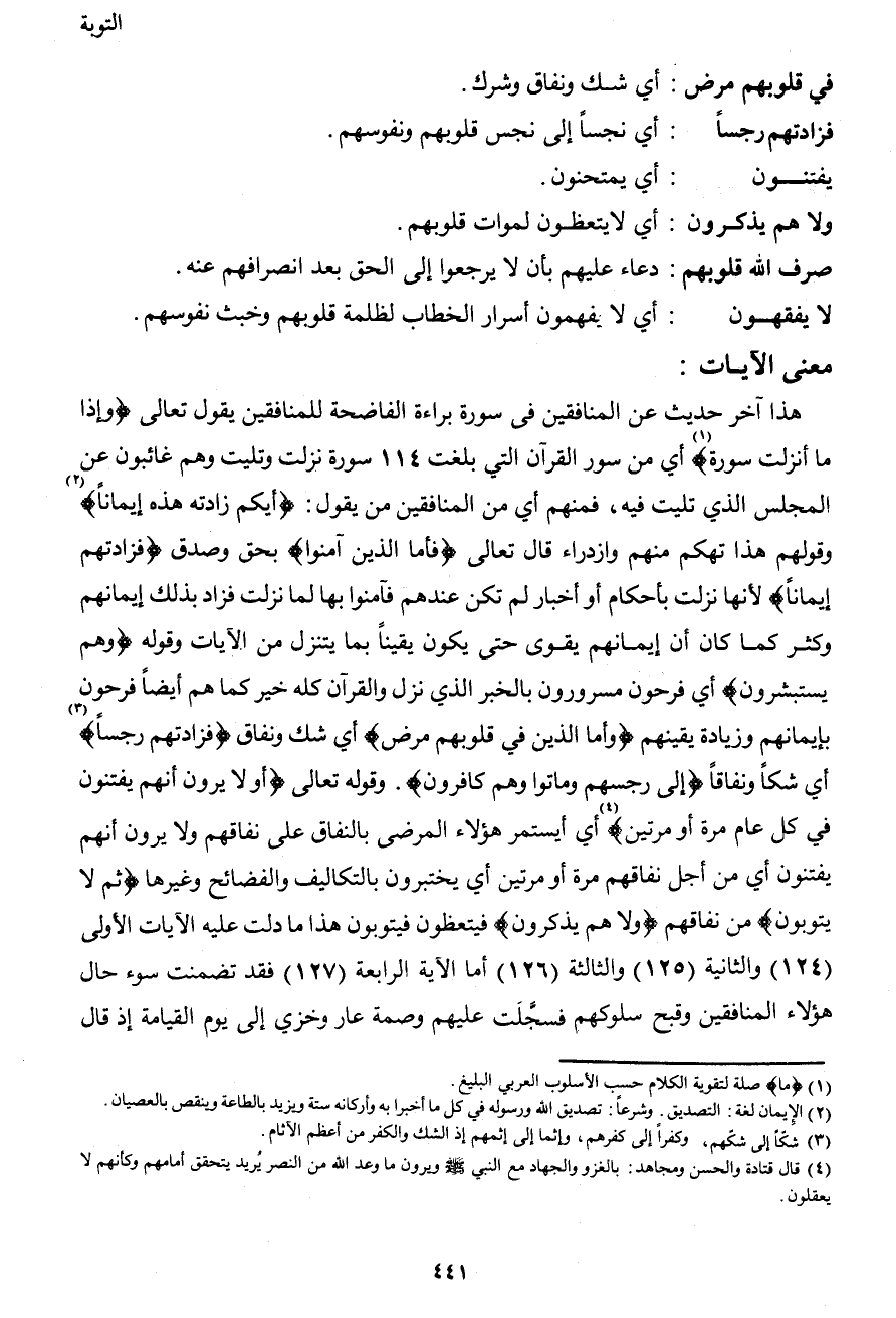هذا آخر حديث عن المنافقين في سورة براءة الفاضحة للمنافقين يقول تعالى {وإذا ما أنزلت سورة} 1 أي من سور القرآن التي بلغت 114 سورة نزلت وتليت وهم غائبون عن المجلس الذي تليت فيه، فمنهم أي من المنافقين من يقول: {أيكم زادته هذه إيماناً} 2 وقولهم هذا تهكم منهم وازدراء قال تعالى {فأما الذين آمنوا} بحق وصدق {فزادتهم إيماناً} لأنها نزلت بأحكام أو أخبار لم تكن عندهم فآمنوا بها لما نزلت فزاد بذلك إيمانهم وكثر كما كان أن إيمانهم يقوى حتى يكون يقيناً بما يتنزل من الآيات وقوله {وهم يستبشرون} أي فرحون مسرورون بالخبر الذي نزل والقرآن كله خير كما هم أيضاً فرحون بإيمانهم وزيادة يقينهم {وأما الذين في قلوبهم مرض} أي شك ونفاق {فزادتهم رجساًَ} 3 أي شكاً ونفاقاً {إلى رجسهم وماتوا وهم كافرون} . وقوله تعالى {أو لا يرون أنهم يفتنون في كل عام مرة أو مرتين} 4 أي أيستمر هؤلاء المرضى بالنفاق على نفاقهم ولا يرون أنهم يفتنون أي من أجل نفاقهم مرة أو مرتين أي يختبرون بالتكاليف والفضائح وغيرها {ثم لا يتوبون} من نفاقهم {ولا هم يذكرون} فيتعظون فيتوبون هذا ما دلت عليه الآيات الأولى (124) والثانية (125) والثالثة (126) أما الآية الرابعة (127) فقد تضمنت سوء حال هؤلاء المنافقين وقبح سلوكهم فسجَّلت عليهم وصمة عار وخزي إلى يوم القيامة إذ قال
