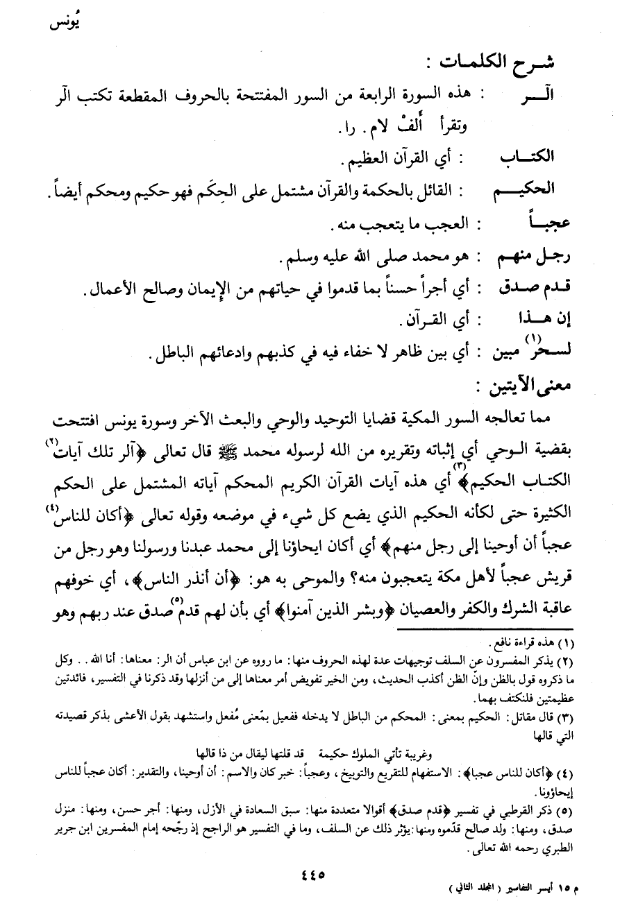 2 يذكر المفسرون عن السلف توجيهات عدة لهذه الحروف منها: ما رووه عن ابن عباس أن الر: معناها. أنا الله.. وكل ما ذكروه قول بالظن وإنّ الظن أكذب الحديث، ومن الخير تفويض أمر معناها إلى من أنزلها وقد ذكرنا في التفسير، فائدتين عظيمتين فلنكتف بهما.