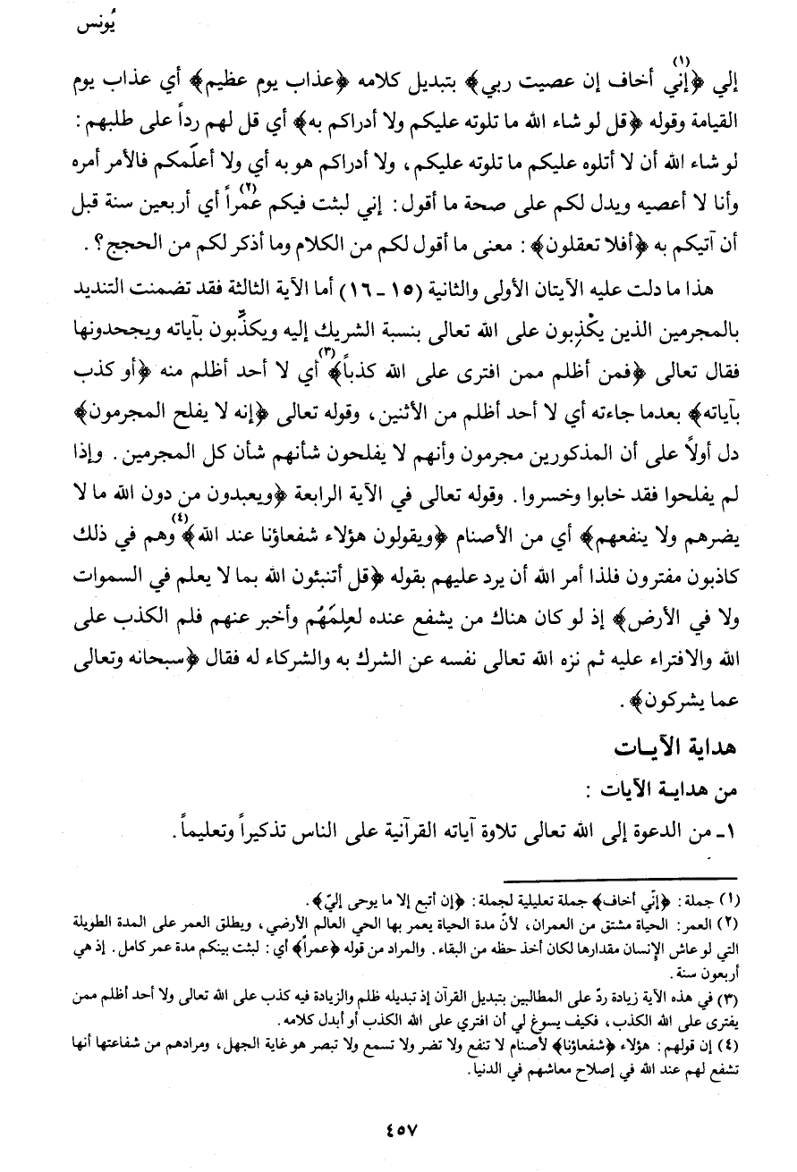 هذا ما دلت عليه الآيتان الأولى والثانية (15- 16) أما الآية الثالثة فقد تضمنت التنديد بالمجرمين الذين يكْذِبون على الله تعالى بنسبة الشريك إليه ويكذِّبون بآياته ويجحدونها فقال تعالى {فمن أظلم ممن افترى على الله كذباً} 3 أي لا أحد أظلم منه {أو كذب بآياته} بعدما جاءته أي لا أحد أظلم من الاثنين، وقوله تعالى {إنه لا يفلح المجرمون} دل أولاً على أن المذكورين مجرمون وأنهم لا يفلحون شأنهم شأن كل المجرمين. وإذا لم يفلحوا فقد خابوا وخسروا. وقوله تعالى في الآية الرابعة {ويعبدون من دون الله ما لا يضرهم ولا ينفعهم} أي من الأصنام {ويقولون هؤلاء شفعاؤنا عند الله} 4 وهم في ذلك كاذبون مفترون فلذا أمر الله أن يرد عليهم بقوله {قل أتنبئون الله بما لا يعلم في السموات ولا في الأرض} إذ لو كان هناك من يشفع عنده لعلِمَهُم وأخبر عنهم فلم الكذب على الله والافتراء عليه ثم نزه الله تعالى نفسه عن الشرك به والشركاء له فقال {سبحانه وتعالى عما يشركون} .