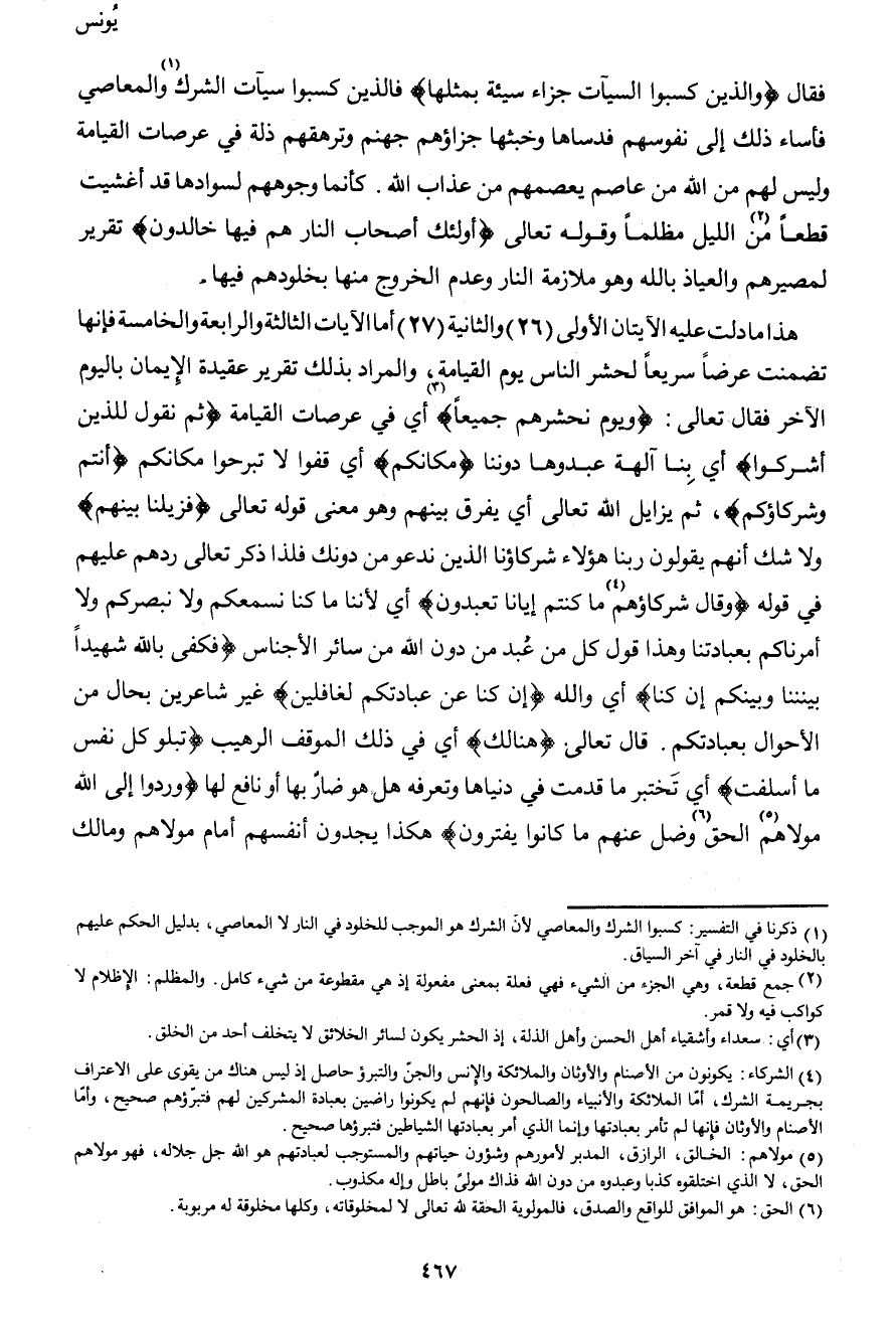 هذا ما دلت عليه الآيتان الأولى (26) والثانية (27) أما الآيات الثالثة والرابعة والخامسة فإنها تضمنت عرضاً سريعاً لحشر الناس يوم القيامة، والمراد بذلك تقرير عقيدة الإيمان باليوم الآخر فقال تعالى: {ويوم نحشرهم جميعاً} 3 أي في عرصات القيامة {ثم نقول للذين أشركوا} أي بِنا آلهة عبدوها دوننا {مكانكم} أي قفوا لا تبرحوا مكانكم {أنتم وشركاؤكم} ، ثم يزايل الله تعالى أي يفرق بينهم وهو معنى قوله تعالى {فزيلنا بينهم} ولا شك أنهم يقولون ربنا هؤلاء شركاؤنا الذين ندعو من دونك فلذا ذكر تعالى ردهم عليهم في قوله {وقال شركاؤهم4 ما كنتم إيانا تعبدون} أي لأننا ما كنا نسمعكم ولا نبصركم ولا أمرناكم بعبادتنا وهذا قول كل من عُبد من دون الله من سائر الأجناس {فكفى بالله شهيداً بيننا وبينكم إن كنا} أي والله {إن كنا عن عبادتكم لغافلين} غير شاعرين بحال من الأحوال بعبادتكم. قال تعالى {هنالك} أي في ذلك الموقف الرهيب {تبلو كل نفس ما أسلفت} أي تَختبر ما قدمت في دنياها وتعرفه هل هو ضارٌ بها أو نافع لها {وردوا إلى الله مولاهم5 الحق6 وضل عنهم ما كانوا يفترون} هكذا يجدون أنفسهم أمام مولاهم ومالك