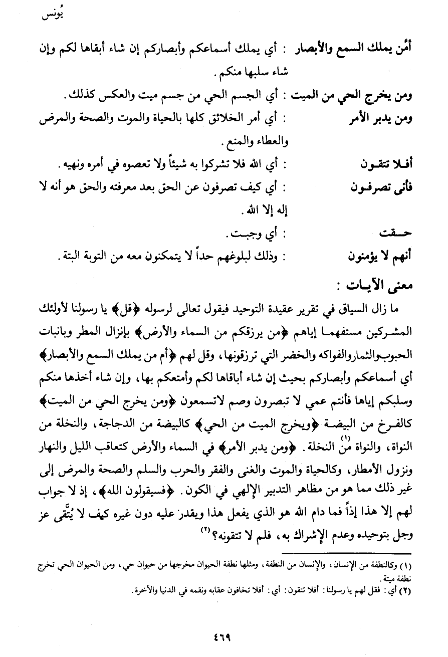 ما زال السياق في تقرير عقيدة التوحيد فيقول تعالى لرسوله {قل} يا رسولنا لأولئك المشركين مستفهماً إياهم {من يرزقكم من السماء والأرض} بإنزال المطر وبانبات الحبوب والثمار والفواكه والخضر التي ترزقونها، وقل لهم {أم من يملك السمع والأبصار} أي أسماعكم وأبصاركم بحيث إن شاء أباقاها لكم وأمتعكم بها، وإن شاء أخذها منكم وسلبكم إياها فأنتم عمي لا تبصرون وصم لا تسمعون {ومن يخرج الحي من الميت} كالفرخ من البيضة {ويخرج الميت من الحي} كالبيضة من الدجاجة، والنخلة من النواة، والنواة من1 النخلة. {ومن يدبر الأمر} في السماء والأرض كتعاقب الليل والنهار ونزول الأمطار، وكالحياة والموت والغنى والفقر والحرب والسلم والصحة والمرض إلى غير ذلك مما هو من مظاهر التدبير الإلهي في الكون. {فسيقولون الله} ، إذ لا جواب لهم إلا هذا إذاً فما دام الله هو الذي يفعل هذا ويقدر عليه دون غيره كيف لا يُتَّقى عز وجل بتوحيده وعدم الإشراك به، فلم لا تتقونه؟ 2