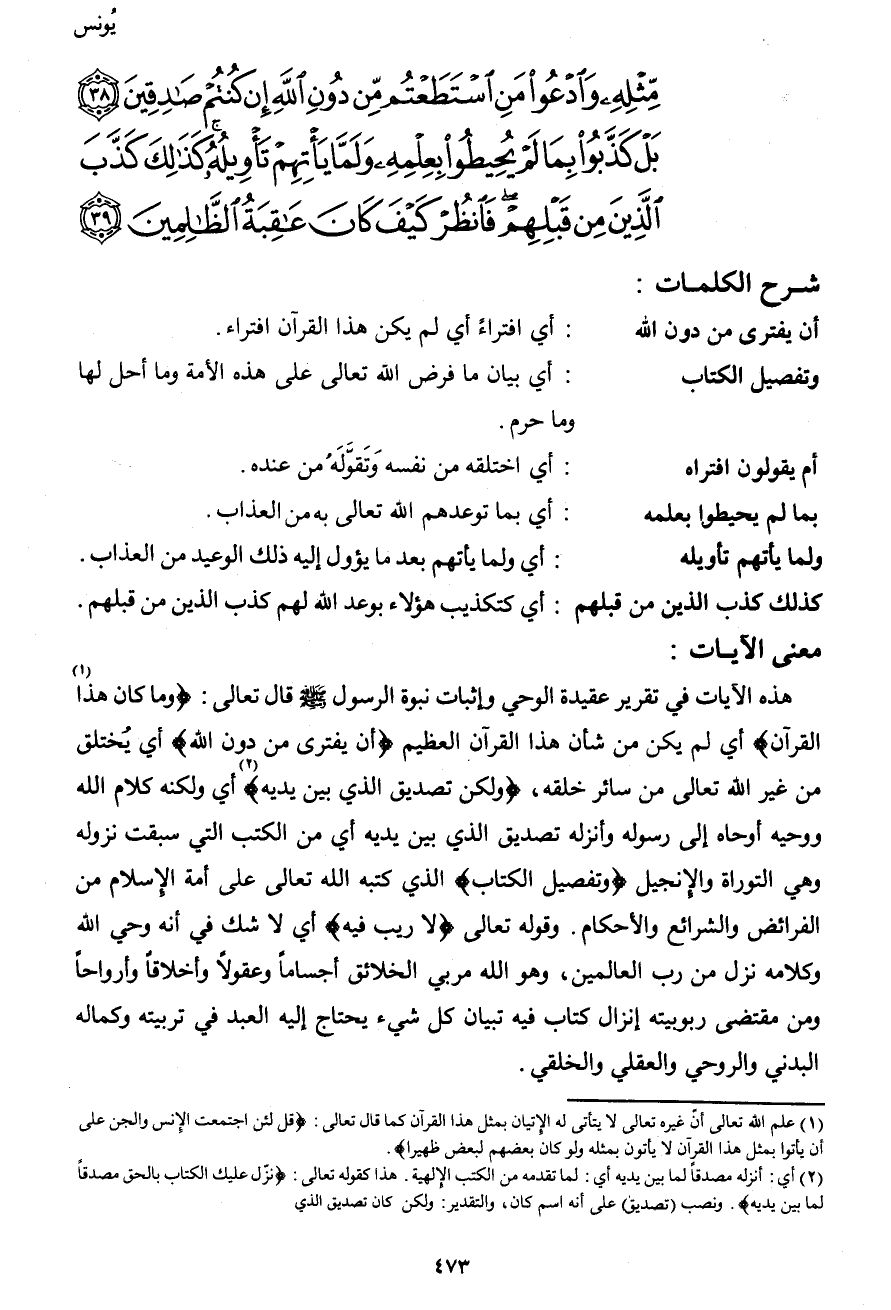 مِّثْلِهِ وَادْعُواْ مَنِ اسْتَطَعْتُم مِّن دُونِ اللهِ إِن كُنتُمْ صَادِقِينَ (38) بَلْ كَذَّبُواْ بِمَا لَمْ يُحِيطُواْ بِعِلْمِهِ وَلَمَّا يَأْتِهِمْ تَأْوِيلُهُ كَذَلِكَ كَذَّبَ الَّذِينَ مِن قَبْلِهِمْ فَانظُرْ كَيْفَ كَانَ عَاقِبَةُ الظَّالِمِينَ (39)