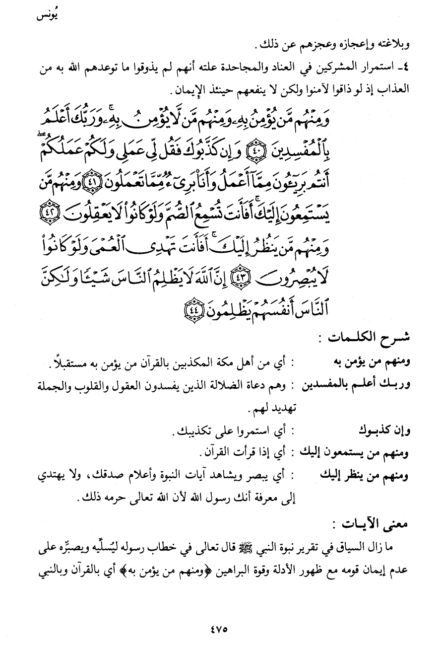 وَمِنهُم مَّن يُؤْمِنُ بِهِ وَمِنْهُم مَّن لاَّ يُؤْمِنُ بِهِ وَرَبُّكَ أَعْلَمُ بِالْمُفْسِدِينَ (40) وَإِن كَذَّبُوكَ فَقُل لِّي عَمَلِي وَلَكُمْ عَمَلُكُمْ أَنتُمْ بَرِيئُونَ مِمَّا أَعْمَلُ وَأَنَاْ بَرِيءٌ مِّمَّا تَعْمَلُونَ (41) وَمِنْهُم مَّن يَسْتَمِعُونَ إِلَيْكَ أَفَأَنتَ تُسْمِعُ الصُّمَّ وَلَوْ كَانُواْ لاَ يَعْقِلُونَ (42) وَمِنهُم مَّن يَنظُرُ إِلَيْكَ أَفَأَنتَ تَهْدِي الْعُمْيَ وَلَوْ كَانُواْ لاَ يُبْصِرُونَ (43) إِنَّ اللهَ لاَ يَظْلِمُ النَّاسَ شَيْئًا وَلَكِنَّ النَّاسَ أَنفُسَهُمْ يَظْلِمُونَ (44)