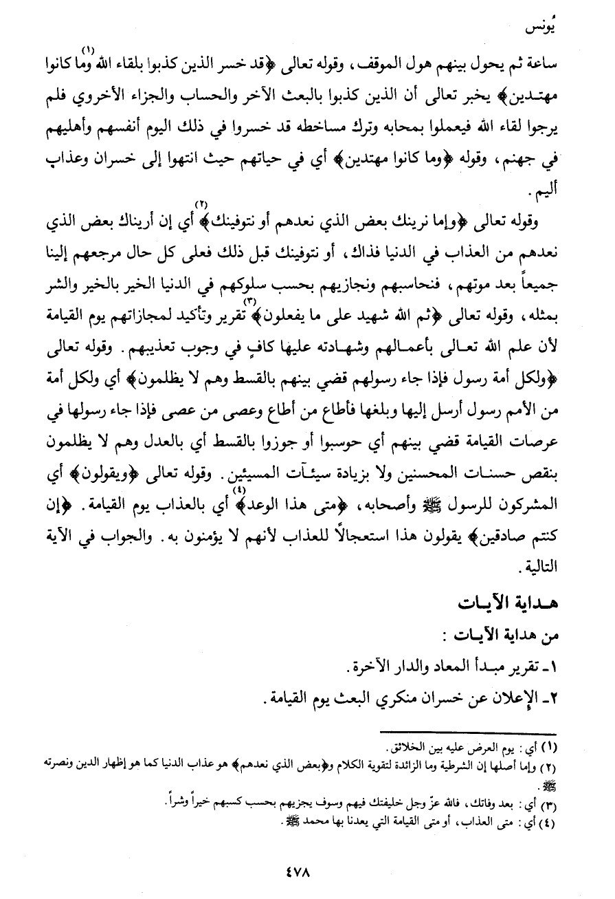 وقوله تعالى {وإما نرينك بعض الذي نعدهم أو نتوفينك} 2 أي إن أريناك بعض الذي نعدهم من العذاب في الدنيا فذاك، أو نتوفينك قبل ذلك فعلى كل حال مرجعهم إلينا جميعاً بعد موتهم، فنحاسبهم ونجازيهم بحسب سلوكهم في الدنيا الخير بالخير والشر بمثله، وقوله تعالى {ثم الله شهيد على ما يفعلون} 3 تقرير وتأكيد لمجازاتهم يوم القيامة لأن علم الله تعالى بأعمالهم وشهادته عليها كافٍ في وجوب تعذيبهم. وقوله تعالى {ولكل أمة رسول فإذا جاء رسولهم قضي بينهم بالقسط وهم لا يظلمون} أي ولكل أمة من الأمم رسول أرسل إليها وبلغها فأطاع من أطاع وعصى من عصى فإذا جاء رسولها في عرصات القيامة قضي بينهم أي حوسبوا أو جوزوا بالقسط أي بالعدل وهم لا يظلمون بنقص حسنات المحسنين ولا بزيادة سيئآت المسيئين. وقوله تعالى {ويقولون} أي المشركون للرسول صَلَّى اللهُ عَلَيْهِ وَسَلَّمَ وأصحابه، {متى هذا الوعد} 4 أي بالعذاب يوم القيامة. {إن كنتم صادقين} يقولون هذا استعجالاً للعذاب لأنهم لا يؤمنون به. والجواب في الآية التالية.