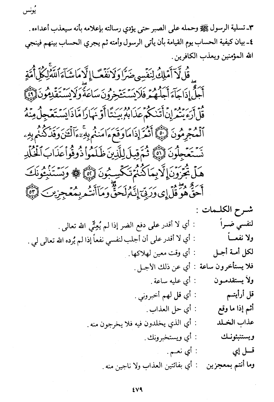 قُل لاَّ أَمْلِكُ لِنَفْسِي ضَرًّا وَلاَ نَفْعًا إِلاَّ مَا شَاء اللهُ لِكُلِّ أُمَّةٍ أَجَلٌ إِذَا جَاء أَجَلُهُمْ فَلاَ يَسْتَأْخِرُونَ سَاعَةً وَلاَ يَسْتَقْدِمُونَ (49) قُلْ أَرَأَيْتُمْ إِنْ أَتَاكُمْ عَذَابُهُ بَيَاتًا أَوْ نَهَارًا مَّاذَا يَسْتَعْجِلُ مِنْهُ الْمُجْرِمُونَ (50) أَثُمَّ إِذَا مَا وَقَعَ آمَنْتُم بِهِ آلآنَ وَقَدْ كُنتُم بِهِ تَسْتَعْجِلُونَ (51) ثُمَّ قِيلَ لِلَّذِينَ ظَلَمُواْ ذُوقُواْ عَذَابَ الْخُلْدِ هَلْ تُجْزَوْنَ إِلاَّ بِمَا كُنتُمْ تَكْسِبُونَ (52) وَيَسْتَنبِئُونَكَ أَحَقٌّ هُوَ قُلْ إِي وَرَبِّي إِنَّهُ لَحَقٌّ وَمَا أَنتُمْ بِمُعْجِزِينَ (53)