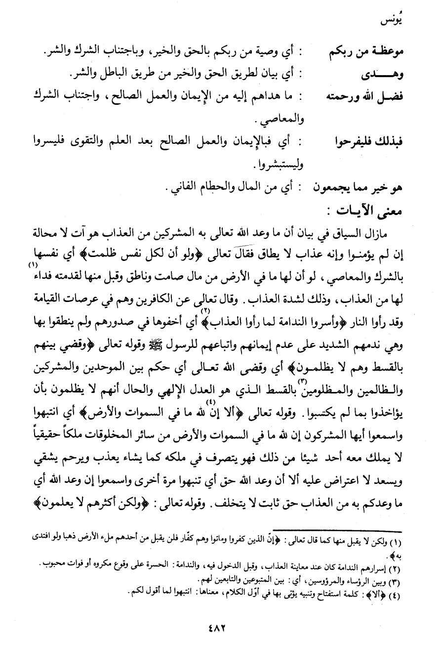 ما زال السياق في بيان أن ما وعد الله تعالى به المشركين من العذاب هو آت لا محالة إن لم يؤمنوا وإنه عذاب لا يطاق فقال تعالى {ولو أن لكل نفس ظلمت} أي نفسها بالشرك والمعاصي، لو أن لها ما في الأرض من مال صامت وناطق وقبل منها لقدمته فداء1 لها من العذاب، وذلك لشدة العذاب. وقال تعالى عن الكافرين وهم في عرصات القيامة وقد رأوا النار {وأسروا الندامة لما رأوا العذاب} 2 أي أخفوها في صدورهم ولم ينطقوا بها وهى ندمهم الشديد على عدم إيمانهم وإتباعهم للرسول صَلَّى اللهُ عَلَيْهِ وَسَلَّمَ وقوله تعالى {وقضي بينهم بالقسط وهم لا يظلمون} أي وقضى الله تعالى أي حكم بين الموحدين والمشركين والظالمين والمظلومين3 بالقسط الذي هو العدل الإلهي والحال أنهم لا يظلمون بأن يؤاخذوا بما لم يكتسبوا. وقوله تعالى {ألا إن4 لله ما في السموات والأرض} أي انتبهوا واسمعوا أيها المشركون إن لله ما في السموات والأرض من سائر المخلوقات ملكاً حقيقياً لا يملك معه أحد شيئا من ذلك فهو يتصرف في ملكه كما يشاء يعذب ويرحم يشقي ويسعد لا اعتراض عليه ألا أن وعد الله حق أي تنبهوا مرة أخرى واسمعوا إن وعد الله أي ما وعدكم به من العذاب حق ثابت لا يتخلف. وقوله تعالى: {ولكن أكثرهم لا يعلمون} .