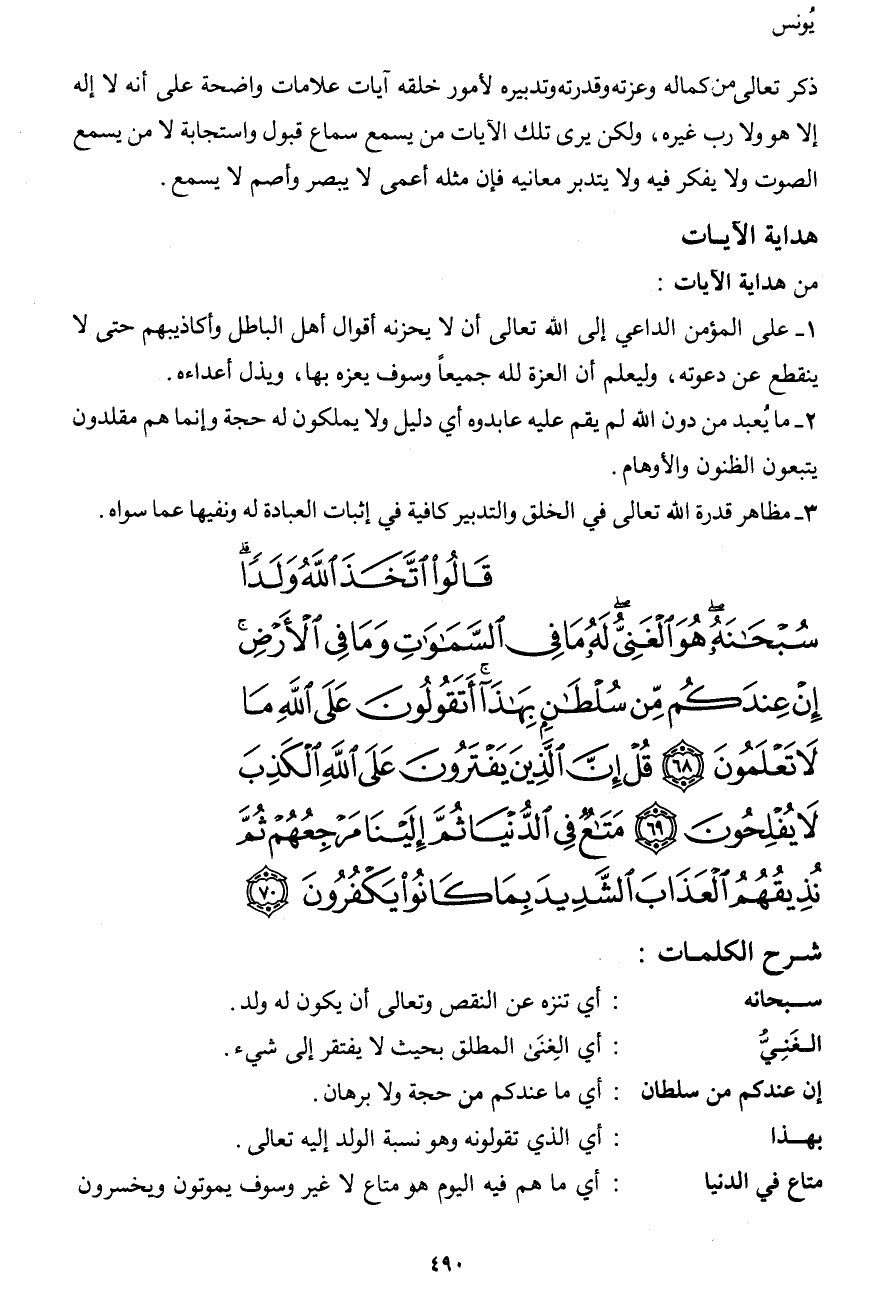 قَالُواْ اتَّخَذَ اللهُ وَلَدًا سُبْحَانَهُ هُوَ الْغَنِيُّ لَهُ مَا فِي السَّمَاوَات وَمَا فِي الأَرْضِ إِنْ عِندَكُم مِّن سُلْطَانٍ بِهَذَا أَتقُولُونَ عَلَى اللهِ مَا لاَ تَعْلَمُونَ (68) قُلْ إِنَّ الَّذِينَ يَفْتَرُونَ عَلَى اللهِ الْكَذِبَ لاَ يُفْلِحُونَ (69) مَتَاعٌ فِي الدُّنْيَا ثُمَّ إِلَيْنَا مَرْجِعُهُمْ ثُمَّ نُذِيقُهُمُ الْعَذَابَ الشَّدِيدَ بِمَا كَانُواْ يَكْفُرُونَ (70)