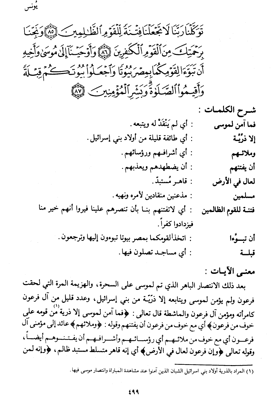 بعد ذلك الانتصار الباهر الذي تم لموسى على السحرة، والهزيمة المرة التي لحقت فرعون ولم يؤمن لموسى ويتابعه إلا ذرّيّة من بني إسرائيل، وعدد قليل من آل فرعون كامرأته ومؤمن آل فرعون والماشطة قال تعالى: {فما آمن لموسى إلا ذرية1 من قومه على خوف من فرعون} أي مع خوف من فرعون أن يفتنهم وقوله: {وملائهم} عائد إلى مؤمنى آل فرعون أي مع خوف من ملائهم أي رؤسائهم وأشرافهم أن يفتنوهم أيضاً، وقوله تعالى {وإن فرعون لعال في الأرض} أي إنه قاهر متسلط مستبد ظالم، {وإنه لمن