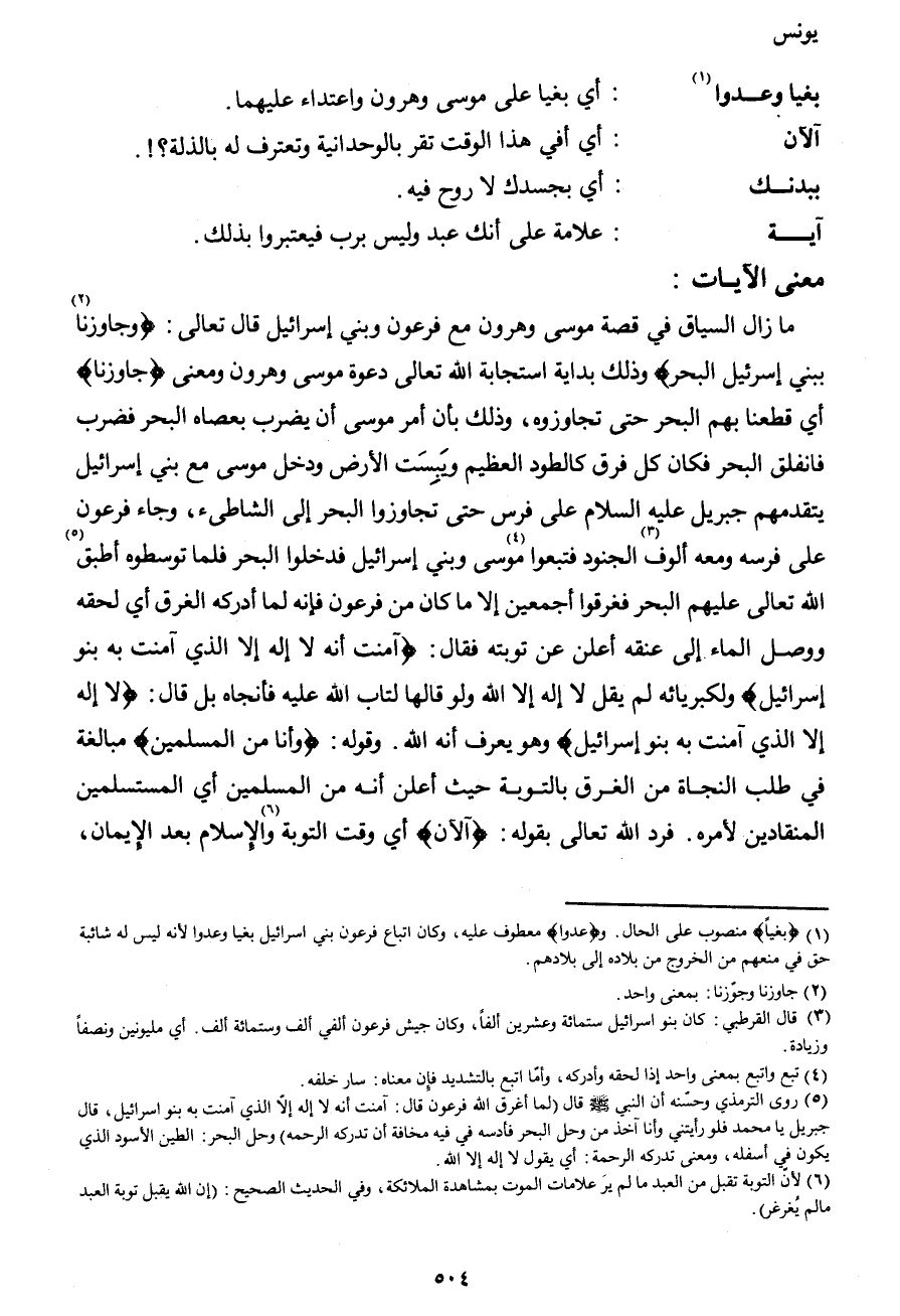 ما زال السياق في قصة موسى وهرون مع فرعون وبني إسرائيل قال تعالى: {وجاوزنا2 ببني إسرائيل البحر} وذلك بداية استجابة الله تعالى دعوة موسى وهرون ومعنى {جاوزنا} أي قطعنا بهم البحر حتى تجاوزوه، وذلك بأن أمر موسى أن يضرب بعصاه البحر فضرب فانفلق البحر فكان كل فرق كالطود العظيم ويَبِسَت الأرض ودخل موسى مع بني إسرائيل يتقدمهم جبريل عليه السلام على فرس حتى تجاوزوا البحر إلى الشاطىء، وجاء فرعون على فرسه ومعه ألوف3 الجنود فتبعوا موسى4 وبني إسرائيل فدخلوا البحر فلما توسطوه أطبق5 الله تعالى عليهم البحر فغرقوا أجمعين إلا ما كان من فرعون فإنه لما أدركه الغرق أي لحقه ووصل الماء إلى عنقه أعلن عن توبته فقال: {آمنت أنه لا إله إلا الذي آمنت به بنو إسرائيل} ولكبريائه لم يقل لا إله إلا الله ولو قالها لتاب الله عليه فأنجاه بل قال: {لا إله إلا الذي آمنت به بنو إسرائيل} وهو يعرف أنه الله. وقوله: {وأنا من المسلمين} مبالغة في طلب النجاة من الغرق بالتوبة حيث أعلن أنه من المسلمين أي المستسلمين المنقادين لأمره. فرد الله تعالى بقوله: {آلآن} أي وقت التوبة6 والإسلام بعد الإيمان،