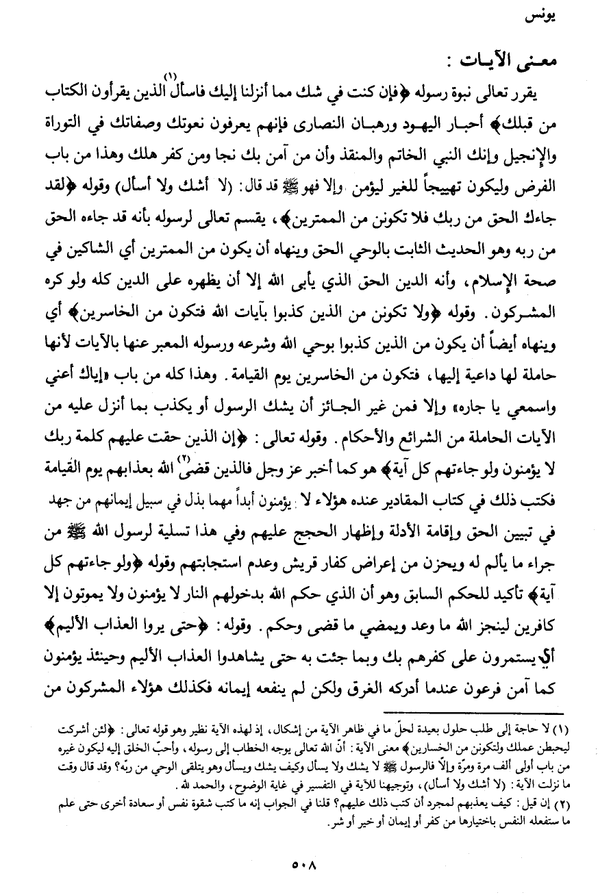 1 لا حاجة إلى طلب حلول بعيدة لحلّ ما في ظاهر الآية من إشكال، إذ لهذه الآية نطير وهو قوله تعالى: {لئن أشركت ليحبطن عملك ولتكونن من الخاسرين} معنى الآية: أنّ الله تعالى يوجه الخطاب إلى رسوله، وأحبّ الخلق إليه ليكون غيره من باب أولى ألف مرة ومرّة وإلا فالرسول صَلَّى اللهُ عَلَيْهِ وَسَلَّمَ لا يشك ولا يسأل وكيف يشك ويسأل وهو يتلقى الوحي من ربّه؟ وقد قال وقت ما نزلت الآية: "لا أشك ولا أسأل"، وتوجيهنا للآية في التفسير في غاية الوضوح، والحمد لله.