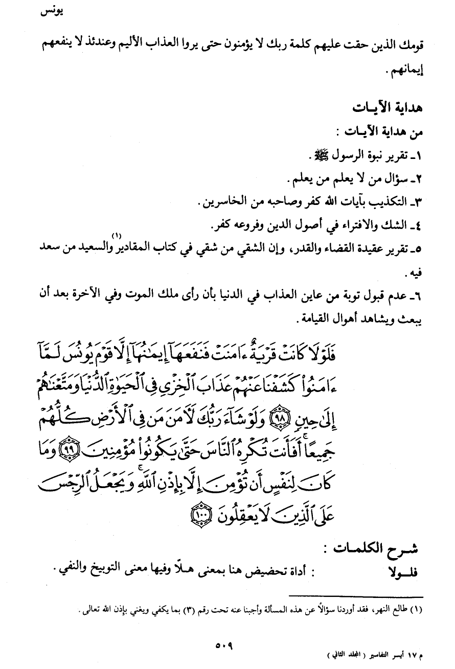 فَلَوْلاَ كَانَتْ قَرْيَةٌ آمَنَتْ فَنَفَعَهَا إِيمَانُهَا إِلاَّ قَوْمَ يُونُسَ لَمَّآ آمَنُواْ كَشَفْنَا عَنْهُمْ عَذَابَ الخِزْيِ فِي الْحَيَاةَ الدُّنْيَا وَمَتَّعْنَاهُمْ إِلَى حِينٍ (98) وَلَوْ شَاء رَبُّكَ لآمَنَ مَن فِي الأَرْضِ كُلُّهُمْ جَمِيعًا أَفَأَنتَ تُكْرِهُ النَّاسَ حَتَّى يَكُونُواْ مُؤْمِنِينَ (99) وَمَا كَانَ لِنَفْسٍ أَن تُؤْمِنَ إِلاَّ بِإِذْنِ اللهِ وَيَجْعَلُ الرِّجْسَ عَلَى الَّذِينَ لاَ يَعْقِلُونَ (100)
