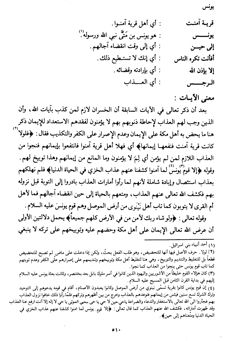 4 إن قوم يونس كانوا بقرية تسمّى نينوي من أرض الموصل وكانوا يعبدون الأصنام، أقام في قومه يدعوهم إلى التوحيد وترك الشرك تسع سنين فيئس من إيمانهم فتوعدهم بالعذاب وخرج من بين أظهرهم وتركهم فلمّا رأوا ذلك خافوا نزول العذاب بهم فجأروا إلى الله تعالى بالاستغفار والدعاء والضراعة يا حي حين لا حي يا حي محيي الموتى يا حي لا إله إلا أنت ارفع عنا العذاب وقد ظهرت أماراته، فكشف الله عنهم العذاب كما قال تعالى: {إلا قوم يونس لما آمنوا كشفنا عنهم عذاب الخزي في الحياة الدنيا ومتعناهم إلى حين} .