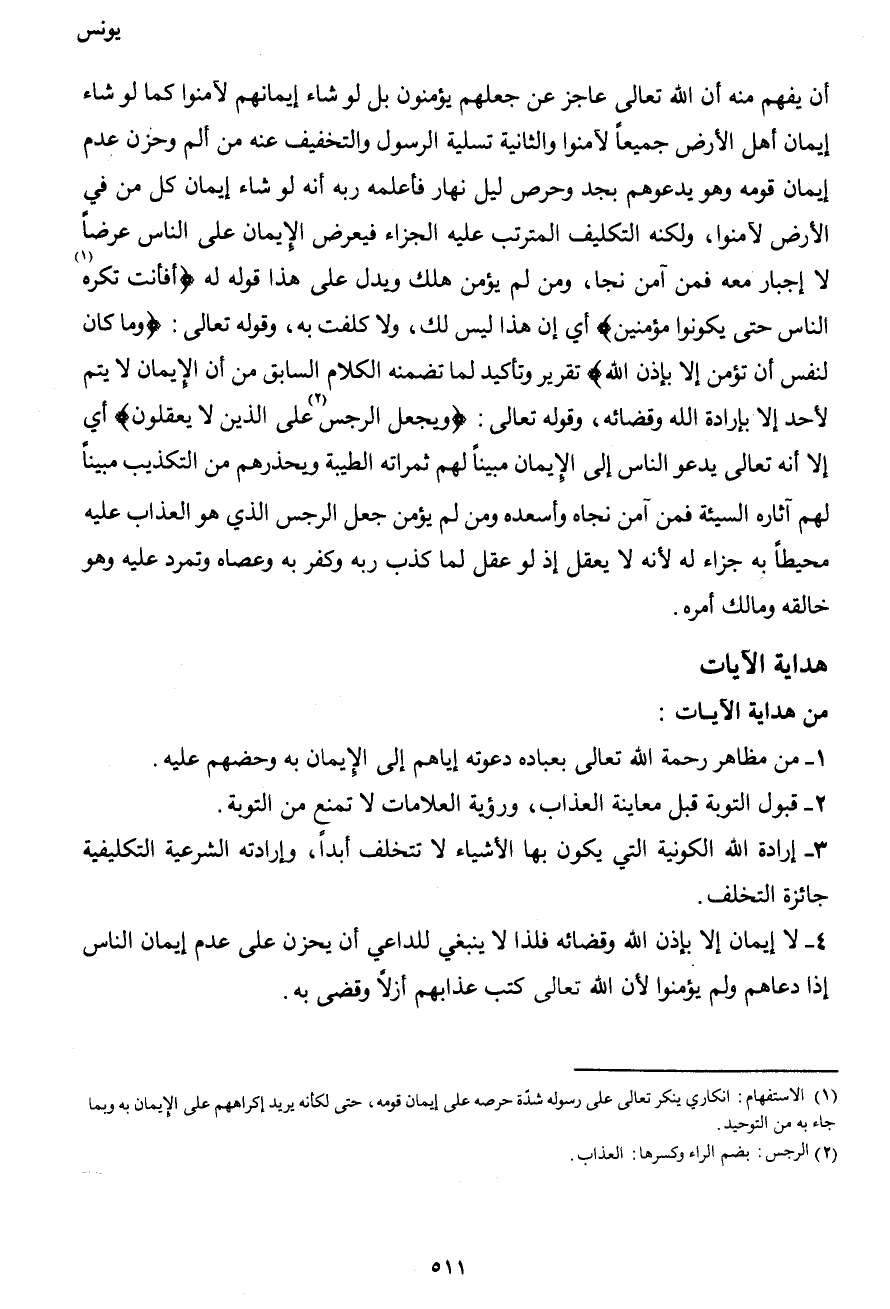 أن يفهم منه أن الله تعالى عاجز عن جعلهم يؤمنون بل لو شاء إيمانهم لآمنوا كما لو شاء إيمان أهل الأرض جميعاً لآمنوا والثانية تسلية الرسول والتخفيف عنه من ألم وحزن عدم إيمان قومه وهو يدعوهم بجد وحرص ليل نهار فأعلمه ربه أنه لو شاء إيمان كل من في الأرض لآمنوا، ولكنه التكليف المترتب عليه الجزاء فيعرض الإيمان على الناس عرضاً لا إجبار معه فمن آمن نجا، ومن لم يؤمن هلك وبدل على هذا قوله له {أفأنت تكره1 الناس حتى يكونوا مؤمنين} أي إن هذا ليس لك، ولا كلفت به، وقوله تعالى: {وما كان لنفس أن تؤمن إلا بإذن الله} تقرير وتأكيد لما تضمنه الكلام السابق من أن الإيمان لا يتم لأحد إلا بإرادة الله وقضائه، وقوله تعالى: {ويجعل الرجس2 على الذين لا يعقلون} أي إلا أنه تعالى يدعو الناس إلى الإيمان مبيناً لهم ثمراته الطيبة ويحذرهم من التكذيب مبيناً لهم آثاره السيئة فمن آمن نجاه وأسعده ومن لم يؤمن جعل الرجس الذي هو العذاب عليه محيطاً به جزاء له لأنه لا يعقل إذ لو عقل لما كذب ربه وكفر به وعصاه وتمرد عليه وهو خالقه ومالك أمره.