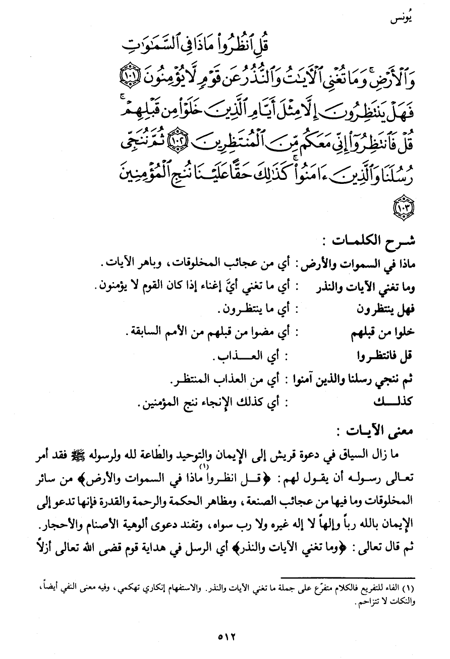 قُلِ انظُرُواْ مَاذَا فِي السَّمَاوَاتِ وَالأَرْضِ وَمَا تُغْنِي الآيَاتُ وَالنُّذُرُ عَن قَوْمٍ لاَّ يُؤْمِنُونَ (101) فَهَلْ يَنتَظِرُونَ إِلاَّ مِثْلَ أَيَّامِ الَّذِينَ خَلَوْاْ مِن قَبْلِهِمْ قُلْ فَانتَظِرُواْ إِنِّي مَعَكُم مِّنَ الْمُنتَظِرِينَ (102) ثُمَّ نُنَجِّي رُسُلَنَا وَالَّذِينَ آمَنُواْ كَذَلِكَ حَقًّا عَلَيْنَا نُنجِ الْمُؤْمِنِينَ (103)