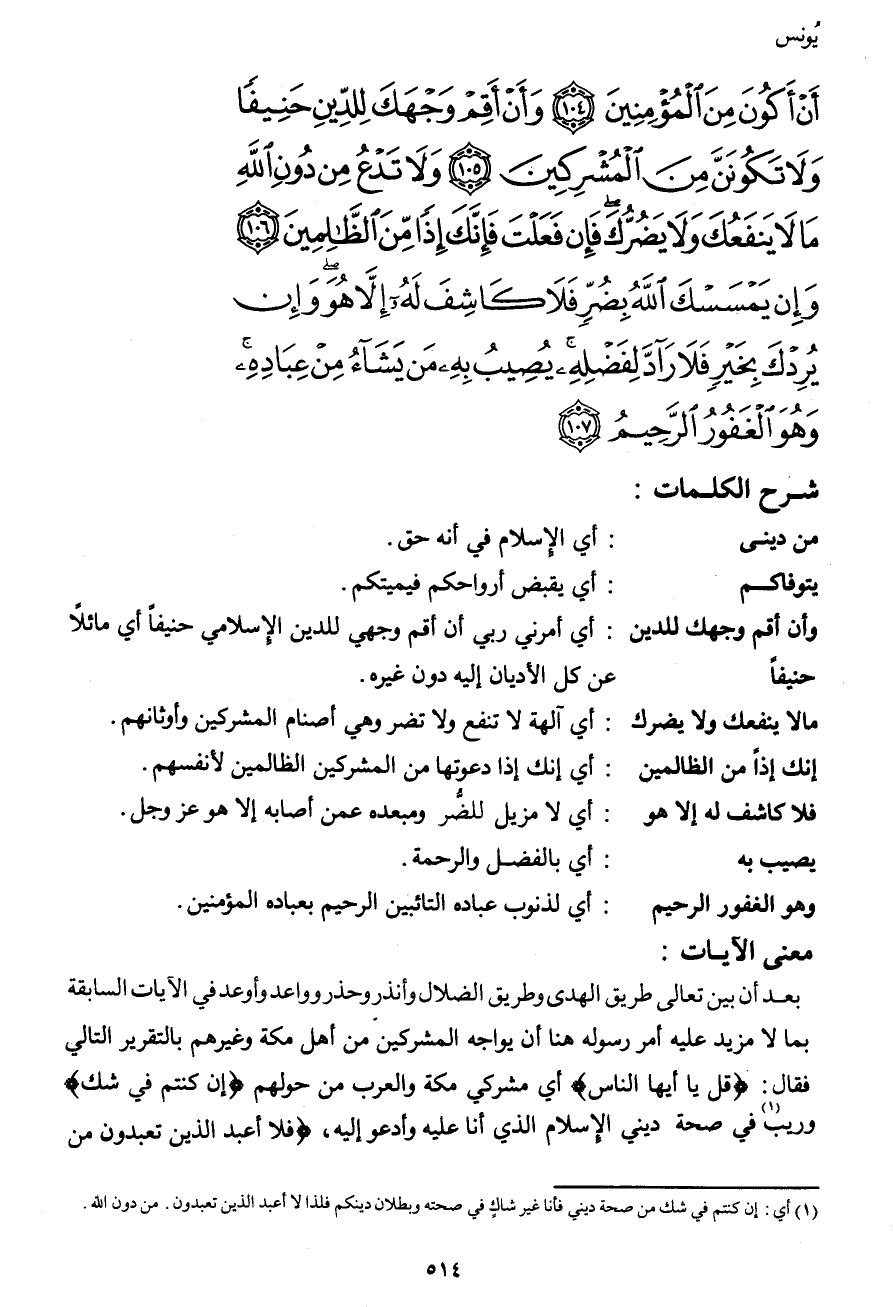 أَنْ أَكُونَ مِنَ الْمُؤْمِنِينَ (104) وَأَنْ أَقِمْ وَجْهَكَ لِلدِّينِ حَنِيفًا وَلاَ تَكُونَنَّ مِنَ الْمُشْرِكِينَ (105) وَلاَ تَدْعُ مِن دُونِ اللهِ مَا لاَ يَنفَعُكَ وَلاَ يَضُرُّكَ فَإِن فَعَلْتَ فَإِنَّكَ إِذًا مِّنَ الظَّالِمِينَ (106) وَإِن يَمْسَسْكَ اللهُ بِضُرٍّ فَلاَ كَاشِفَ لَهُ إِلاَّ هُوَ وَإِن يُرِدْكَ بِخَيْرٍ فَلاَ رَآدَّ لِفَضْلِهِ يُصَيبُ بِهِ مَن يَشَاء مِنْ عِبَادِهِ وَهُوَ الْغَفُورُ الرَّحِيمُ (107)
