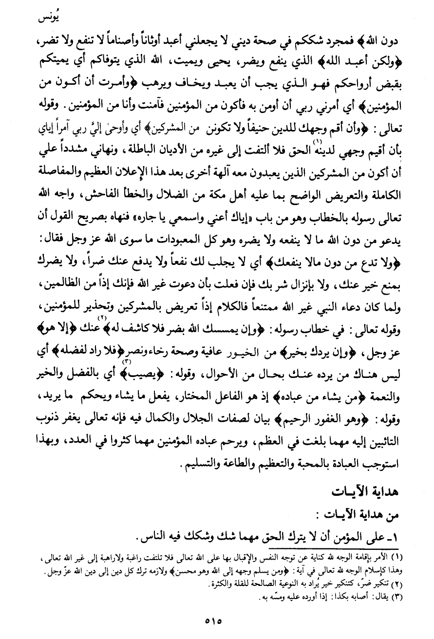 دون الله} فمجرد شككم في صحة ديني لا يجعلني أعبد أوثاناً وأصناماً لا تنفع ولا تضر، {ولكن أعبد الله} الذي ينفع ويضر، يحيى ويميت، الله الذي يتوفاكم أي يميتكم بقبض أرواحكم فهو الذي يجب أن يعبد ويخاف ويرهب {وأمرت أن أكون من المؤمنين} أي أمرني ربي أن أومن به فأكون من المؤمنين فآمنت وأنا من المؤمنين. وقوله تعالى: {وأن أقم وجهك للدين حنيفاً ولا تكونن من المشركين} أي وأوحى إليّ ربي آمراً إياي بأن أقيم وجهي لدينه1 الحق فلا ألتفت إلى غيره من الأديان الباطلة، ونهاني مشدداً عليّ أن أكون من المشركين الذين يعبدون معه آلهة أخرى بعد هذا الإعلان العظيم والمفاصلة الكاملة والتعريض الواضح بما عليه أهل مكة من الضلال والخطأ الفاحش، واجه الله تعالى رسوله بالخطاب وهو من باب "إياك أعنى واسمعي يا جاره" فنهاه بصريح القول أن يدعو من دون الله ما لا ينفعه ولا يضره وهو كل المعبودات ما سوى الله عز وجل فقال: {ولا تدع من دون ما لا ينفعك} أي لا يجلب لك نفعاً ولا يدفع عنك ضراً، ولا يضرك بمنع خير عنك، ولا بإنزال شربك فإن فعلت بأن دعوت غير الله فإنك إذاً من الظالمين، ولما كان دعاء النبي غير الله ممتنعاً فالكلام إذاً تعريض بالمشركين وتحذير للمؤمنين، وقوله تعالى: في خطاب رسوله: {وإن يمسسك الله بضر فلا كاشف له} 2 عنك {إلا هو} عز وجل، {وإن يردك بخير} من الخيور عافية وصحة رخاء ونصر {فلا راد لفضله} أي ليس هناك من يرده عنك بحال من الأحوال، وقوله: {يصيب} 3 أي بالفضل والخير والنعمة {من يشاء من عباده} إذ هو الفاعل المختار، يفعل ما يشاء ويحكم ما يريد، وقوله: {وهو الغفور الرحيم} بيان لصفات الجلال والكمال فيه فإنه تعالى يغفر ذنوب التائبين إليه مهما بلغت في العظم، ويرحم عباده المؤمنين مهما كثروا في العدد، وبهذا استوجب العبادة بالمحبة والتعظيم والطاعة والتسليم.