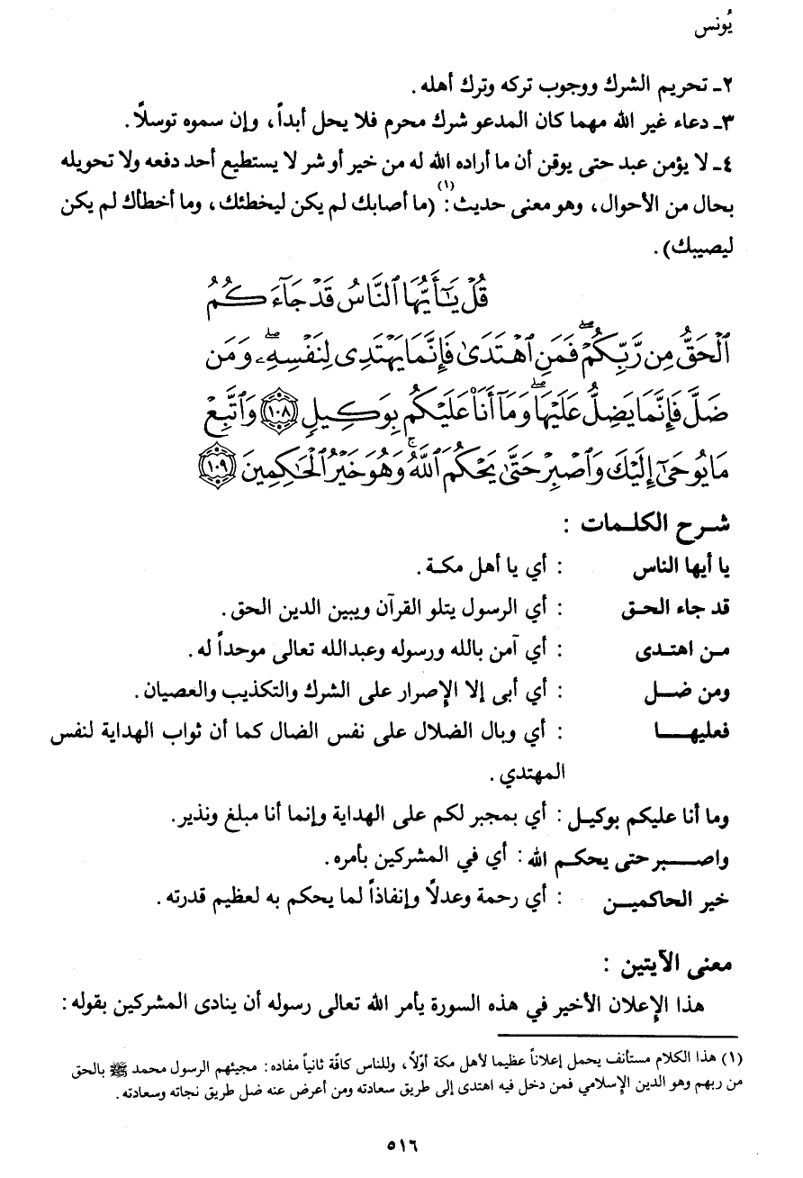 قُلْ يَا أَيُّهَا النَّاسُ قَدْ جَاءكُمُ الْحَقُّ مِن رَّبِّكُمْ فَمَنِ اهْتَدَى فَإِنَّمَا يَهْتَدِي لِنَفْسِهِ وَمَن ضَلَّ فَإِنَّمَا يَضِلُّ عَلَيْهَا وَمَا أَنَاْ عَلَيْكُم بِوَكِيلٍ (108) وَاتَّبِعْ مَا يُوحَى إِلَيْكَ وَاصْبِرْ حَتَّىَ يَحْكُمَ اللهُ وَهُوَ خَيْرُ الْحَاكِمِينَ (109)