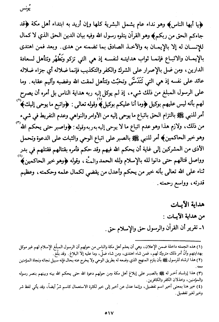 {يا أيها الناس} وهو نداء عام يشمل البشرية كلها وإن أريد به ابتداء أهل مكة {قد جاءكم الحق من ربكم} وهو القرآن يتلوه رسول الله وفيه بيان الدين الحق الذي لا كمال للإنسان له إلا بالإيمان به والأخذ الصادق بما تضمنه من هدى. وبعد فمن اهتدى بالإيمان والاتباع فإنما ثواب هدايته لنفسه إذ هي التي تزكو وتَطْهُر وتتأهل لسعادة الدارين، ومن ضل بالإصرار على الشرك والكفر والتكذيب فإنما ضلاله أي جزاء ضلاله عائد على نفسه إذ هي التي تَتَدَسَّى وتخبُث وتتأهل لمقت الله وغضبه وأليم عقابه. وما على الرسول المبلغ من ذلك شيء، إذ لم يوكل إليه ربه هداية الناس بل أمره أن يصرح لهم بأنه ليس عليهم بوكيل {وما أنا عليكم بوكيل} 1 وقوله تعالى: {واتبع ما يوحى إليك} 2 أمر للنبي صَلَّى اللهُ عَلَيْهِ وَسَلَّمَ بالتزام الحق باتباع ما يوحى إليه من الأوامر والنواهي وعدم التفريط في شيء من ذلك، ولازم هذا وهو عدم اتباع ما لا يوحى إليه به ربه وقوله: {واصبر حتى يحكم الله3 وهو خير الحاكمين} أمر للنبي صَلَّى اللهُ عَلَيْهِ وَسَلَّمَ بالصبر على اتباع الوحي والثبات على الدعوة وتحمل الأذى من المشركين إلى غاية أن يحكم الله فيهم وقد حكم فأمره بقتالهم فقتلهم في بدر وواصل قتالهم حتى دانوا لله بالإسلام ولله الحمد والمنَّة، وقوله {وهو خير الحاكمين} 4 ثناء على الله تعالى بأنه خير من يحكم وأعدل من يقضي لكمال علمه وحكمته، وعظيم قدرته، وواسع رحمته.