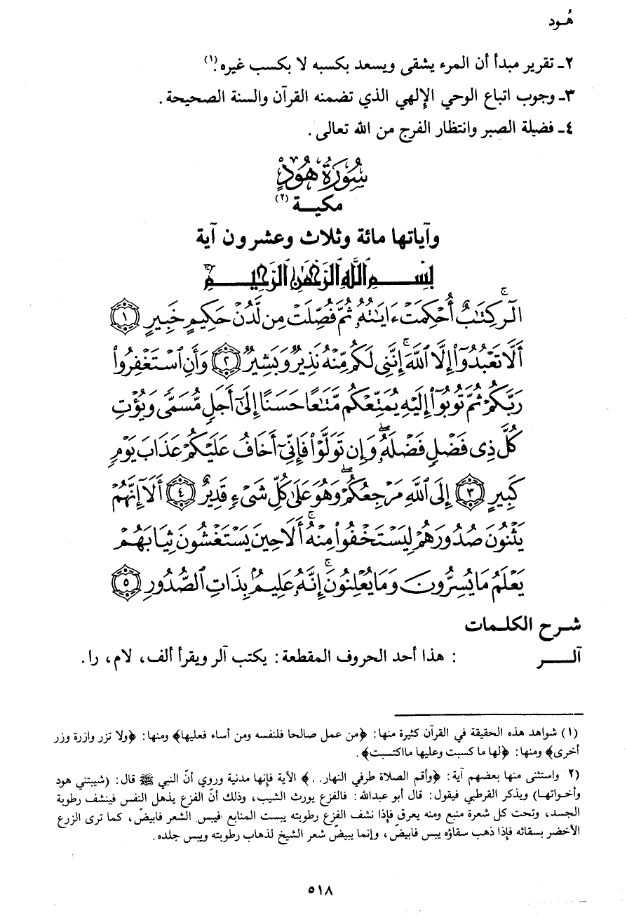 الَر كِتَابٌ أُحْكِمَتْ آيَاتُهُ ثُمَّ فُصِّلَتْ مِن لَّدُنْ حَكِيمٍ خَبِيرٍ (1) أَلاَّ تَعْبُدُواْ إِلاَّ اللهَ إِنَّنِي لَكُم مِّنْهُ نَذِيرٌ وَبَشِيرٌ (2) وَأَنِ اسْتَغْفِرُواْ رَبَّكُمْ ثُمَّ تُوبُواْ إِلَيْهِ يُمَتِّعْكُم مَّتَاعًا حَسَنًا إِلَى أَجَلٍ مُّسَمًّى وَيُؤْتِ كُلَّ ذِي فَضْلٍ فَضْلَهُ وَإِن تَوَلَّوْاْ فَإِنِّيَ أَخَافُ عَلَيْكُمْ عَذَابَ يَوْمٍ كَبِيرٍ (3) إِلَى اللهِ مَرْجِعُكُمْ وَهُوَ عَلَى كُلِّ شَيْءٍ قَدِيرٌ (4) أَلا إِنَّهُمْ يَثْنُونَ صُدُورَهُمْ لِيَسْتَخْفُواْ مِنْهُ أَلا حِينَ يَسْتَغْشُونَ ثِيَابَهُمْ يَعْلَمُ مَا يُسِرُّونَ وَمَا يُعْلِنُونَ إِنَّهُ عَلِيمٌ بِذَاتِ الصُّدُورِ (5)