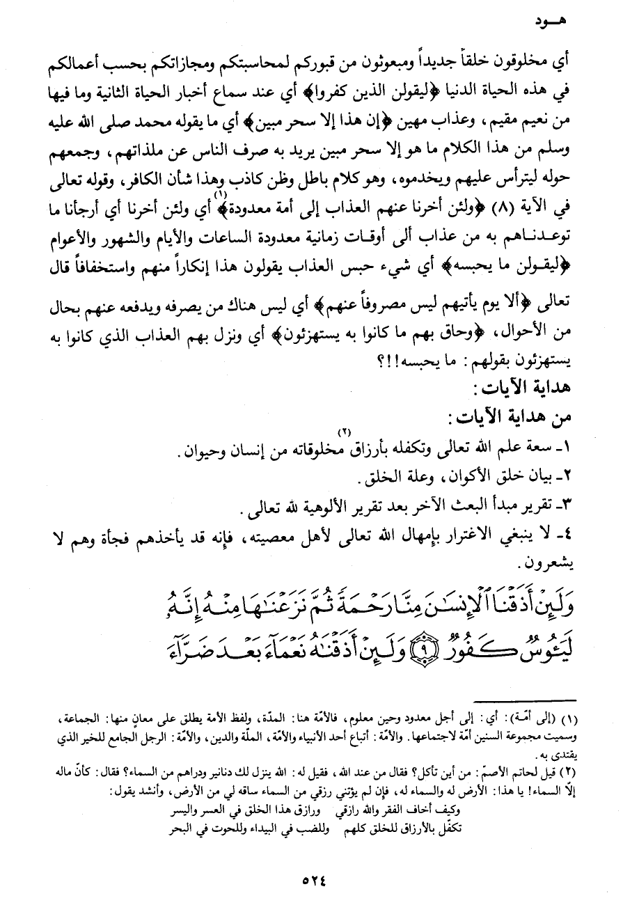 أي مخلوقون خلقاً جديداً ومبعوثون من قبوركم لمحاسبتكم ومجازاتكم بحسب أعمالكم في هذه الحياة الدنيا {ليقولن الذين كفروا} أي عند سماع أخبار الحياة الثانية وما فيها من نعيم مقيم، وعذاب مهين {إن هذا إلا سحر مبين} أي ما يقوله محمد صَلَّى اللهُ عَلَيْهِ وَسَلَّمَ من هذا الكلام ما هو إلا سحر مبين يريد به صرف الناس عن ملذاتهم، وجمعهم حوله ليترأس عليهم ويخدموه، وهو كلام باطل وظن كاذب وهذا شأن الكافر، وقوله تعالى في الآية (8) {ولئن أخرنا عنهم العذاب إلى أمة معدودة} 1 أي ولئن أخرنا أي أرجأنا ما توعدناهم به من عذاب ألى أوقات زمانية معدودة الساعات والأيام والشهور والأعوام {ليقولن ما يحبسه} أي شيء حبس العذاب يقولون هذا إنكاراً منهم واستخفافاً قال تعالى {ألا يوم يأتيهم ليس مصروفاً عنهم} أي ليس هناك من يصرفه ويدفعه عنهم بحال من الأحوال، {وحاق بهم ما كانوا به يستهزئون} أي ونزل بهم العذاب الذي كانوا به يستهزئون بقولهم: ما يحبسه!!؟