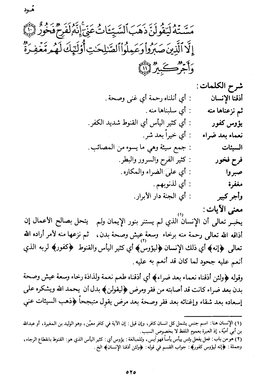 مَسَّتْهُ لَيَقُولَنَّ ذَهَبَ السَّيِّئَاتُ عَنِّي إِنَّهُ لَفَرِحٌ فَخُورٌ (10) إِلاَّ الَّذِينَ صَبَرُواْ وَعَمِلُواْ الصَّالِحَاتِ أُوْلَئِكَ لَهُم مَّغْفِرَةٌ وَأَجْرٌ كَبِيرٌ (11)