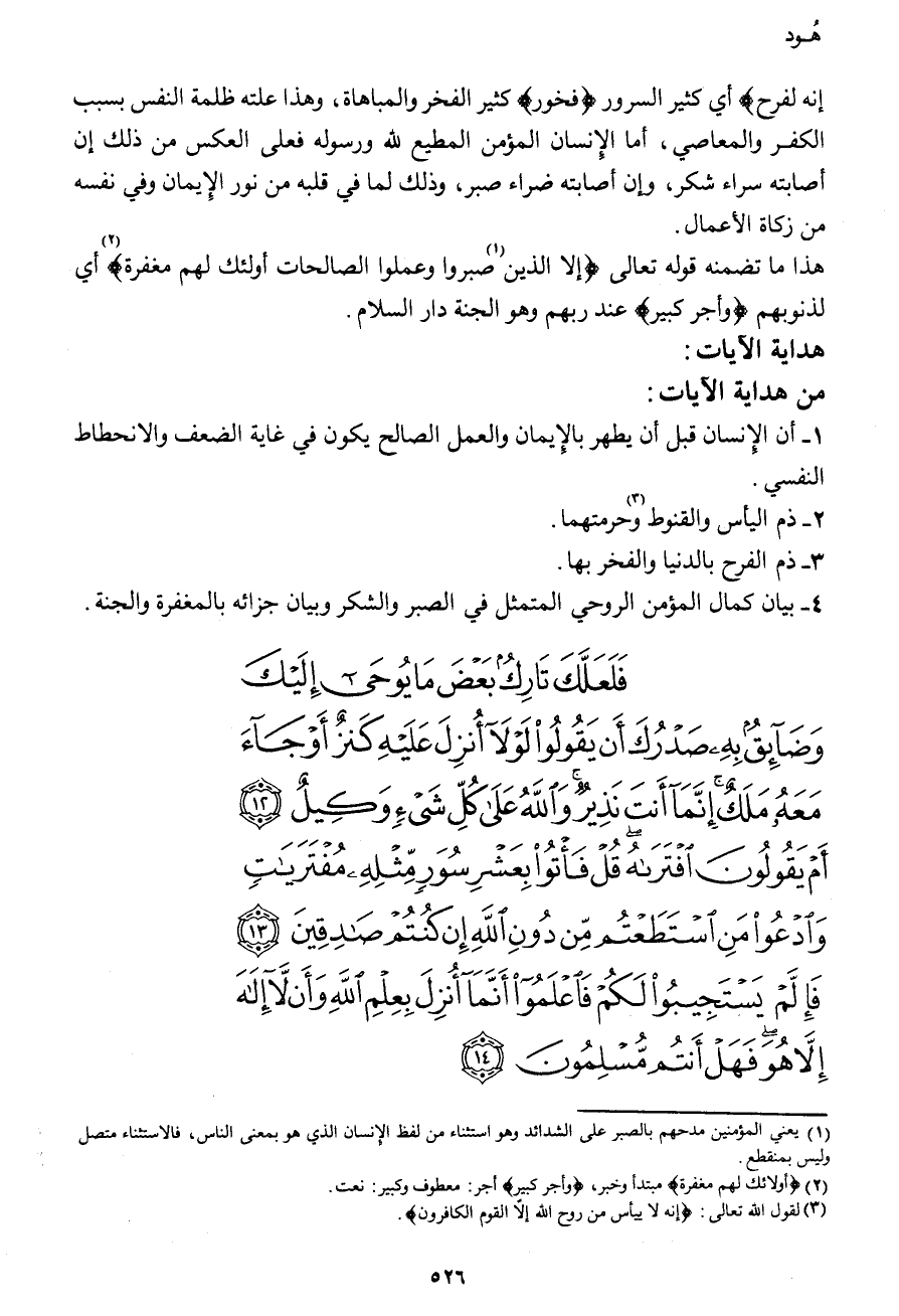 فَلَعَلَّكَ تَارِكٌ بَعْضَ مَا يُوحَى إِلَيْكَ وَضَآئِقٌ بِهِ صَدْرُكَ أَن يَقُولُواْ لَوْلاَ أُنزِلَ عَلَيْهِ كَنزٌ أَوْ جَاء مَعَهُ مَلَكٌ إِنَّمَا أَنتَ نَذِيرٌ وَاللهُ عَلَى كُلِّ شَيْءٍ وَكِيلٌ (12) أَمْ يَقُولُونَ افْتَرَاهُ قُلْ فَأْتُواْ بِعَشْرِ سُوَرٍ مِّثْلِهِ مُفْتَرَيَاتٍ وَادْعُواْ مَنِ اسْتَطَعْتُم مِّن دُونِ اللهِ إِن كُنتُمْ صَادِقِينَ (13) فَإِن لَّمْ يَسْتَجِيبُواْ لَكُمْ فَاعْلَمُواْ أَنَّمَا أُنزِلِ بِعِلْمِ اللهِ وَأَن لاَّ إِلَهَ إِلاَّ هُوَ فَهَلْ أَنتُم مُّسْلِمُونَ (14)