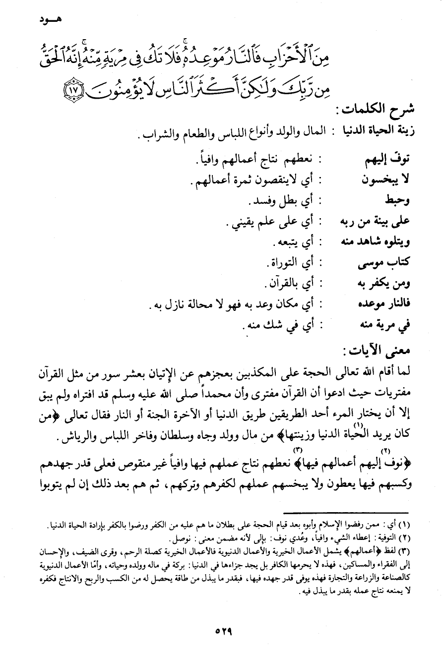 لما أقام الله تعالى الحجة على المكذبين بعجزهم عن الإتيان بعشر سور من مثل القرآن مفتريات حيث ادعوا أن القرآن مفترى وأن محمداً صَلَّى اللهُ عَلَيْهِ وَسَلَّمَ قد افتراه ولم يبق إلا أن يختار المرء أحد الطريقين طريق الدنيا أو الآخرة الجنة أو النار فقال تعالى {من كان يريد الحياة1 الدنيا وزينتها} من مال وولد وجاه وسلطان وفاخر اللباس والرياش. {نوف2 إليهم أعمالهم فيها} 3 نعطهم نتاج عملهم فيها وافياً غير منقوص فعلى قدر جهدهم وكسبهم فيها يعطون ولا يبخسهم عملهم لكفرهم وتركهم، ثم هم بعد ذلك إن لم يتوبوا