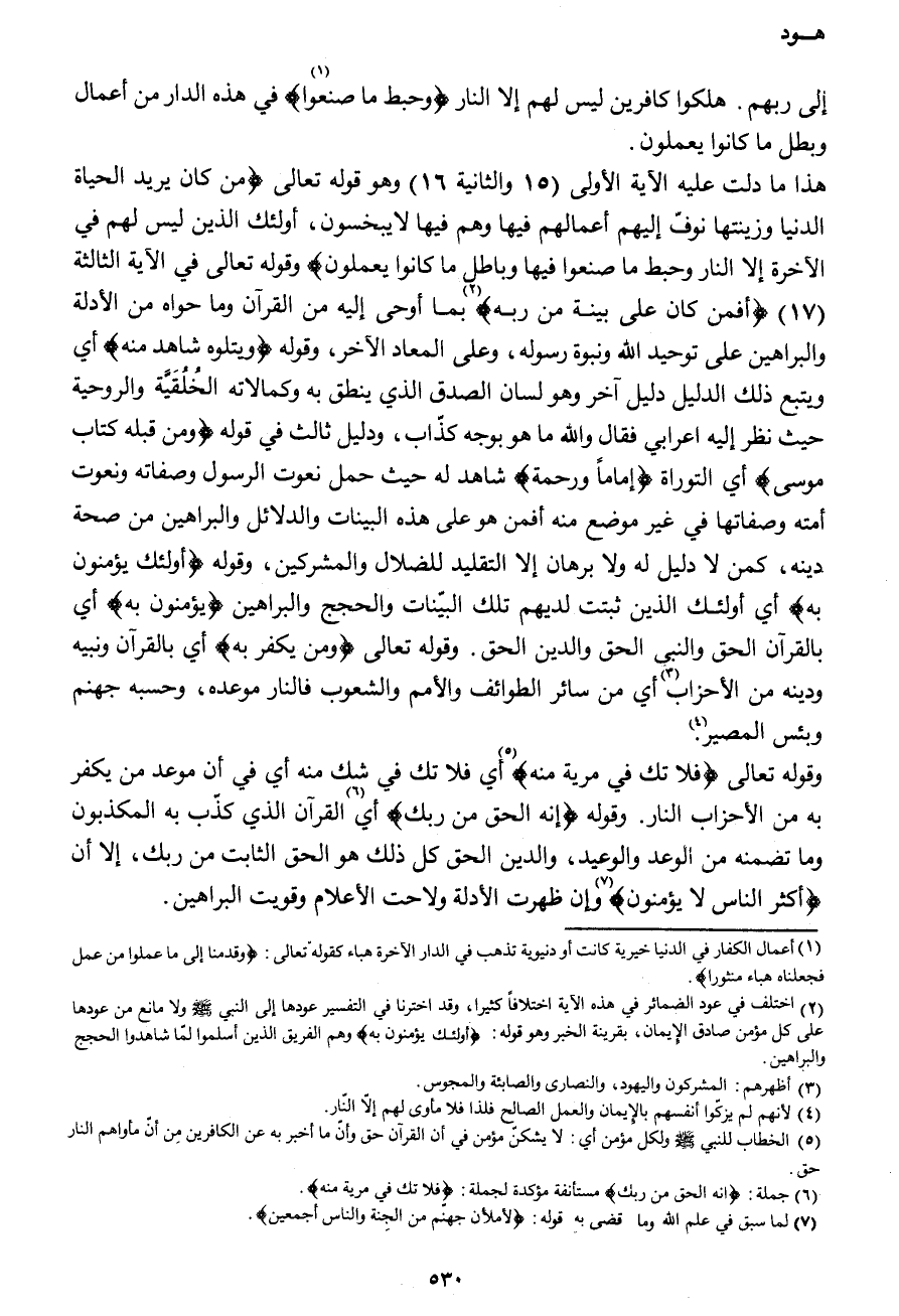 وقوله تعالى {فلا تك في مرية منه} 5 أي فلا تك في شك منه أي في أن موعد من يكفر به من الأحزاب النار. وقوله {إنه الحق من ربك} أي6 القرآن الذي كذّب به المكذبون وما تضمنه من الوعد والوعيد، والدين الحق كل ذلك هو الحق الثابت من ربك، إلا أن {أكثر الناس لا يؤمنون} 7 وإن ظهرت الأدلة ولاحت الأعلام وقويت البراهين.