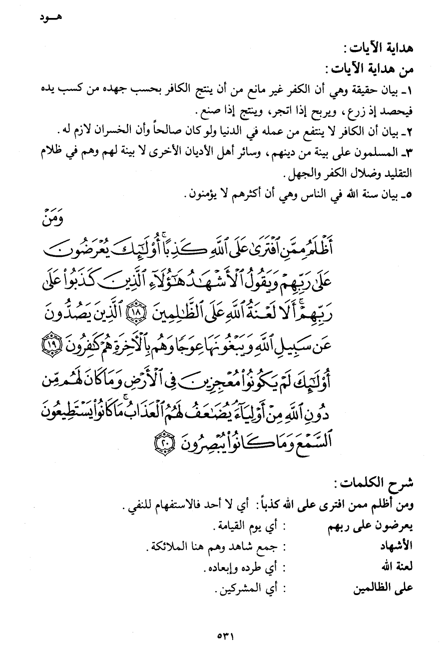 وَمَنْ أَظْلَمُ مِمَّنِ افْتَرَى عَلَى اللهِ كَذِبًا أُوْلَئِكَ يُعْرَضُونَ عَلَى رَبِّهِمْ وَيَقُولُ الأَشْهَادُ هَؤُلاء الَّذِينَ كَذَبُواْ عَلَى رَبِّهِمْ أَلاَ لَعْنَةُ اللهِ عَلَى الظَّالِمِينَ (18) الَّذِينَ يَصُدُّونَ عَن سَبِيلِ اللهِ وَيَبْغُونَهَا عِوَجًا وَهُم بِالآخِرَةِ هُمْ كَافِرُونَ (19) أُولَئِكَ لَمْ يَكُونُواْ مُعْجِزِينَ فِي الأَرْضِ وَمَا كَانَ لَهُم مِّن دُونِ اللهِ مِنْ أَوْلِيَاء يُضَاعَفُ لَهُمُ الْعَذَابُ مَا كَانُواْ يَسْتَطِيعُونَ السَّمْعَ وَمَا كَانُواْ يُبْصِرُونَ (20)