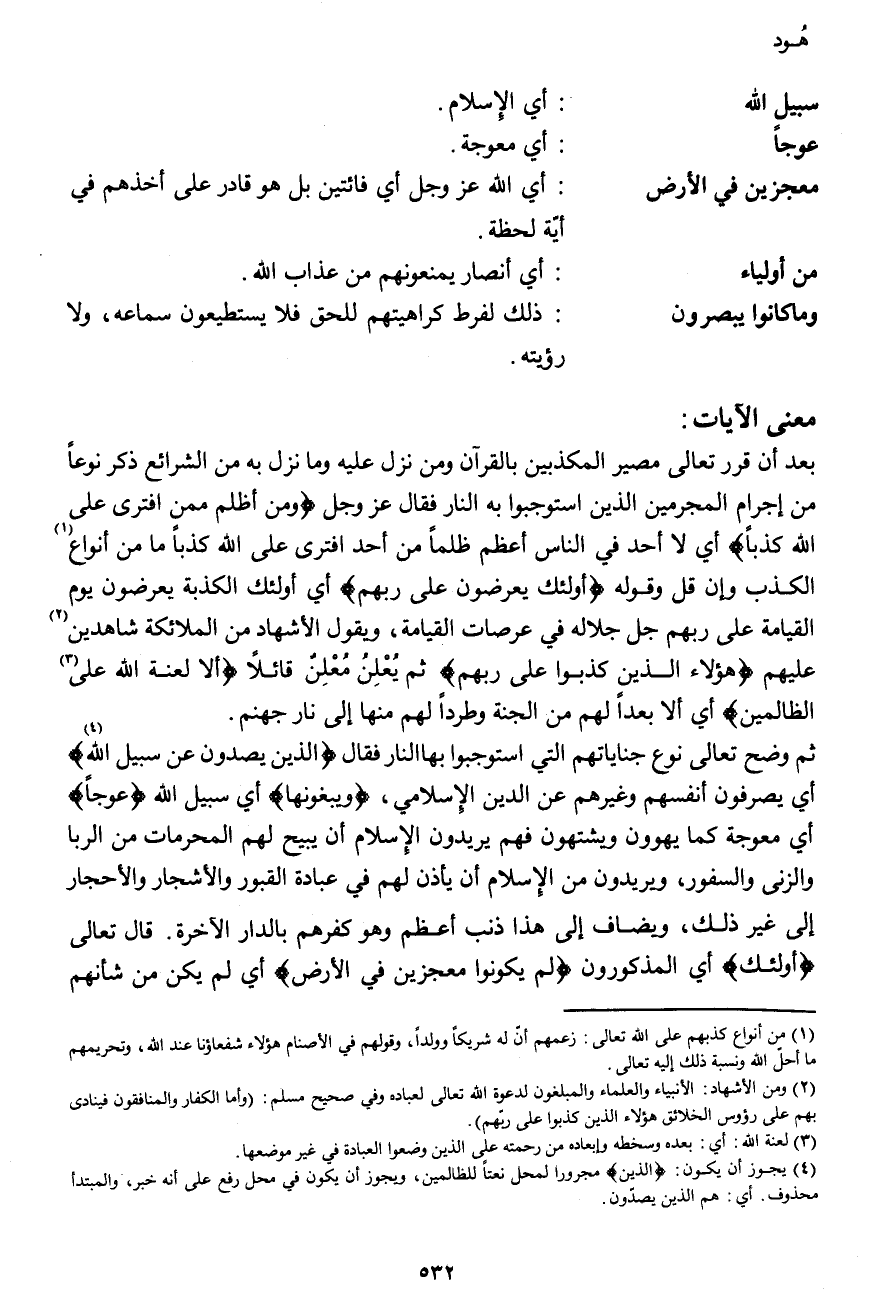 ثم وضح تعالى نوع جناياتهم التي استوجبوا بها النار فقال {الذين يصدون عن سبيل الله} 4 أي يصرفون أنفسهم وغيرهم عن الدين الإسلامي، {ويبغونها} أي سبيل الله {عوجاً} أي معوجه كما يهوون ويشتهون فهم يريدون الإسلام أن يبيح لهم المحرمات من الربا والزنى والسفور، ويريدون من الإسلام أن يأذن لهم في عبادة القبور والأشجار والأحجار إلى غير ذلك، ويضاف إلى هذا ذنب أعظم وهو كفرهم بالدار الآخرة. قال تعالى {أولئك} أي المذكورون {لم يكونوا معجزين في الأرض} أي لم يكن من شأنهم