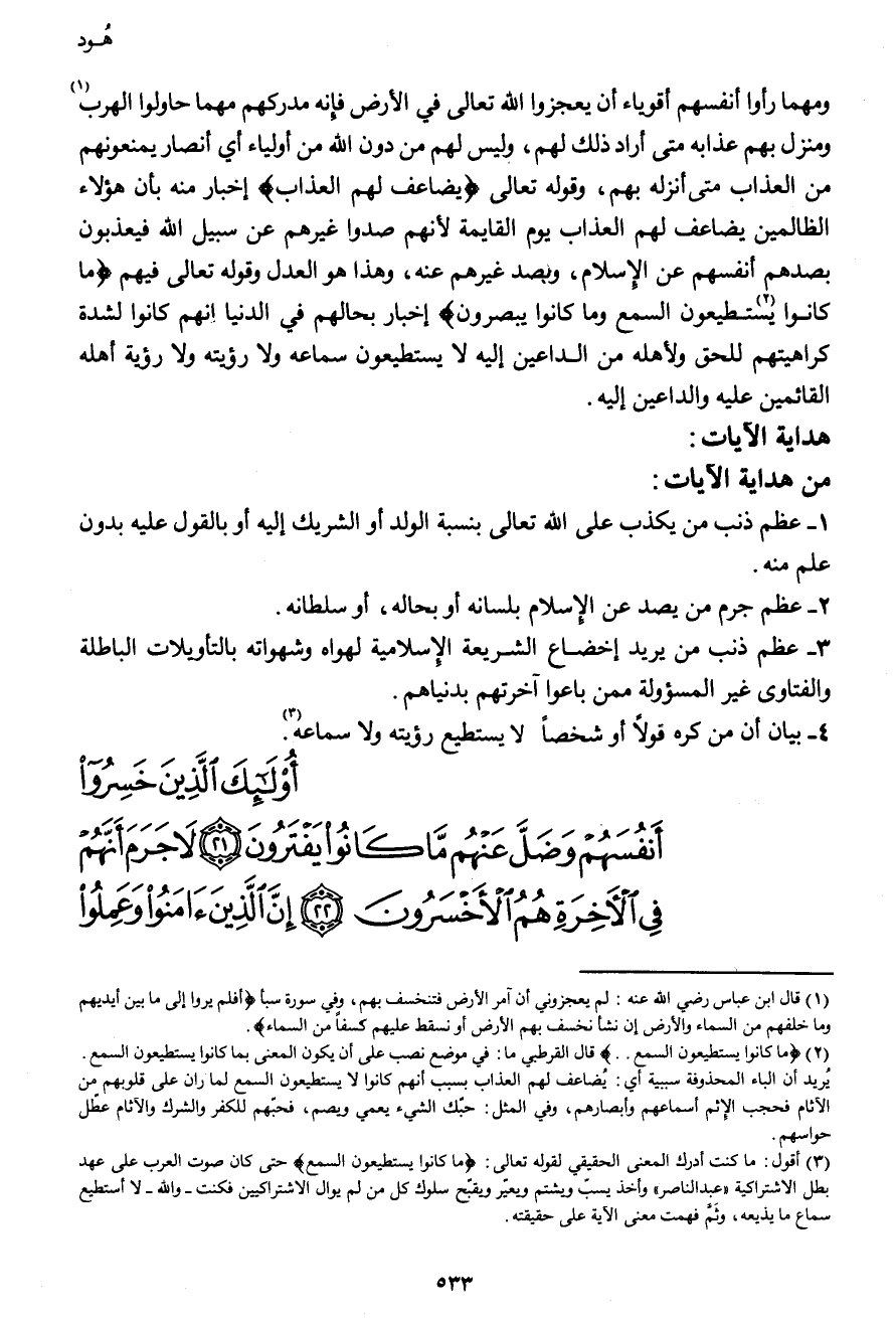 أُوْلَئِكَ الَّذِينَ خَسِرُواْ أَنفُسَهُمْ وَضَلَّ عَنْهُم مَّا كَانُواْ يَفْتَرُونَ (21) لاَ جَرَمَ أَنَّهُمْ فِي الآخِرَةِ هُمُ الأَخْسَرُونَ (22) إِنَّ الَّذِينَ آمَنُواْ وَعَمِلُواْ