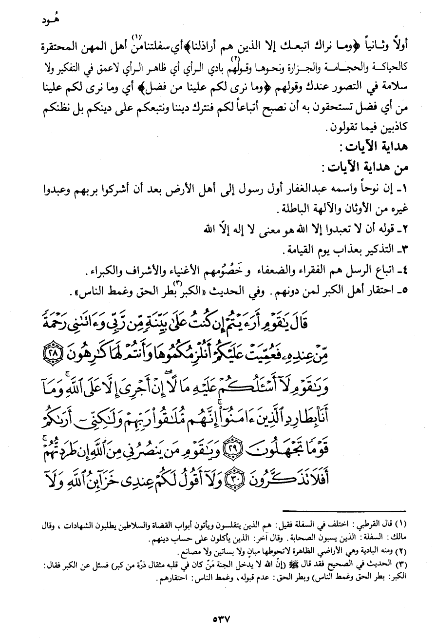 قَالَ يَا قَوْمِ أَرَأَيْتُمْ إِن كُنتُ عَلَى بَيِّنَةٍ مِّن رَّبِّيَ وَآتَانِي رَحْمَةً مِّنْ عِندِهِ فَعُمِّيَتْ عَلَيْكُمْ أَنُلْزِمُكُمُوهَا وَأَنتُمْ لَهَا كَارِهُونَ (28) وَيَا قَوْمِ لا أَسْأَلُكُمْ عَلَيْهِ مَالاً إِنْ أَجْرِيَ إِلاَّ عَلَى اللهِ وَمَآ أَنَاْ بِطَارِدِ الَّذِينَ آمَنُواْ إِنَّهُم مُّلاَقُو رَبِّهِمْ وَلَكِنِّيَ أَرَاكُمْ قَوْمًا تَجْهَلُونَ (29) وَيَا قَوْمِ مَن يَنصُرُنِي مِنَ اللهِ إِن طَرَدتُّهُمْ أَفَلاَ تَذَكَّرُونَ (30) وَلاَ أَقُولُ لَكُمْ عِندِي خَزَآئِنُ اللهِ وَلاَ