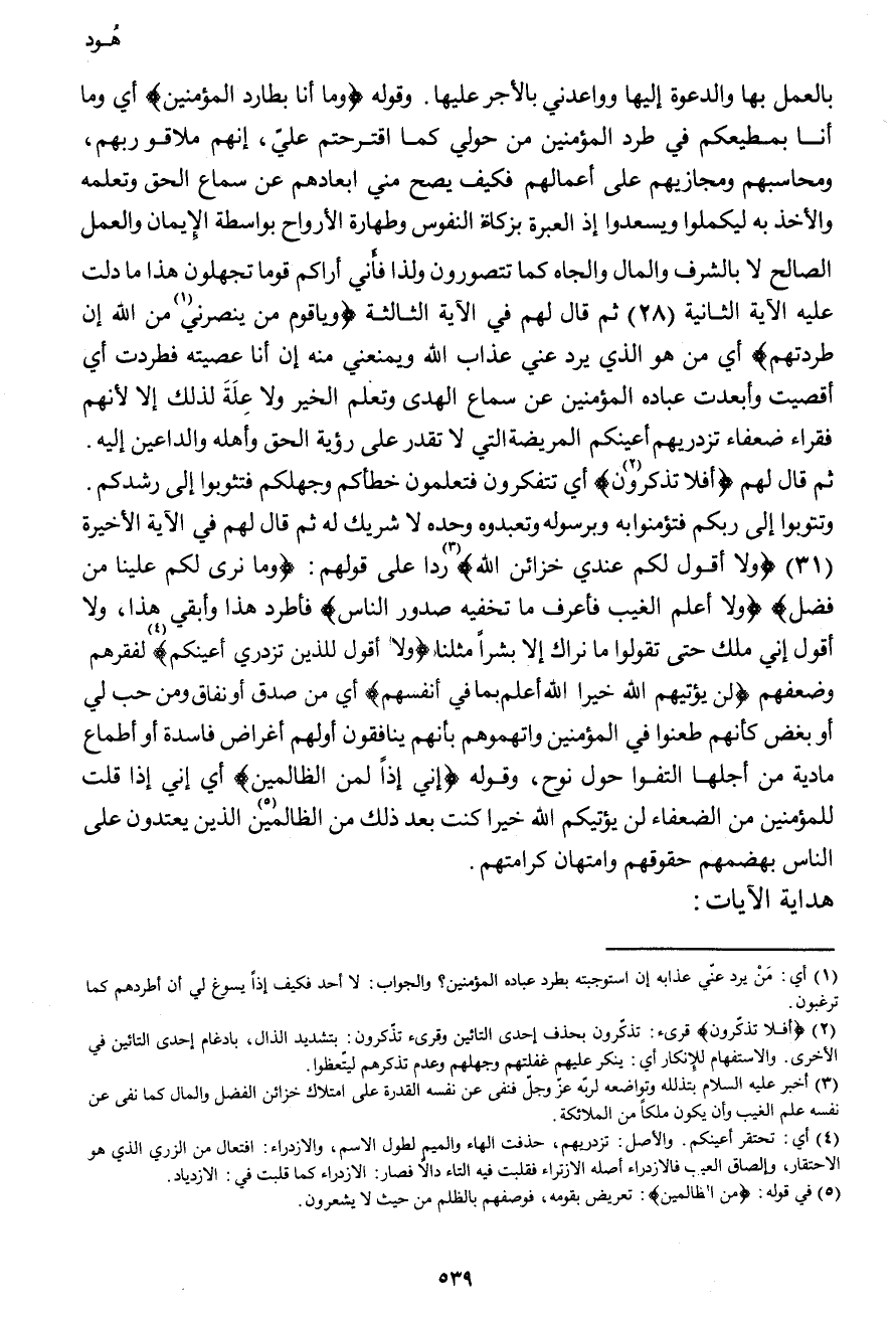 بالعمل بها والدعوة إليها وواعدني بالأجر عليها. وقوله {وما أنا بطارد المؤمنين} أي وما أنا بمطيعكم في طرد المؤمنين من حولي كما اقترحتم عليّ، إنهم ملاقو ربهم، ومحاسبهم ومجازيهم على أعمالهم فكيف يصح مني ابعادهم عن سماع الحق وتعلمه والأخذ به ليكملوا ويسعدوا إذ العبرة بزكاة النفوس وطهارة الأرواح بواسطة الإيمان والعمل الصالح لا بالشرف والمال والجاه كما تتصورون ولذا فإني أراكم قوما تجهلون هذا ما دلت عليه الآية الثانية (28) ثم قال لهم في الآية الثالثة {ويا قوم من ينصرني1 من الله إن طردتهم} أي من هو الذي يرد عنى عذاب الله ويمنعني منه إن أنا عصيته فطردت أي أقصيت وأبعدت عباده المؤمنين عن سماع الهدى وتعلم الخير ولا علة لذلك إلا لأنهم فقراء ضعفاء تزدريهم أعينكم المريضة التي لا تقدر على رؤية الحق وأهله والداعين إليه. ثم قال لهم {أفلا تذكرون2} أي تتفكرون فتعلمون خطأكم وجهلكم فتثوبوا إلى رشدكم. وتتوبوا إلى ربكم فتؤمنوا به وبرسوله وتعبدوه وحده لا شريك له ثم قال لهم في الآية الأخيرة (31) {ولا أقول لكم عندي خزائن الله3} رداً على قولهم: {وما نرى لكم علينا من فضل} {ولا أعلم الغيب} فأعرف ما تخفيه صدور الناس فأطرد هذا وأبقي هذا، ولا أقول إني ملك حتى تقولوا ما نراك إلا بشراً مثلنا {ولا أقول للذين تزدري أعينكم} 4 لفقرهم وضعفهم {لن يؤتيهم الله خيراً الله أعلم بما في أنفسهم} أي من صدق أو نفاق ومن حب لي أو بغض كأنهم طعنوا في المؤمنين واتهموهم بأنهم ينافقون أولهم أغراض فاسدة أو أطماع مادية من أجلها التفوا حول نوح، وقوله {إني إذاً لمن الظالمين} أي إني إذا قلت للمؤمنين من الضعفاء لن يؤتيكم الله خيراً كنت بعد ذلك من الظالمين5 الذين يعتدون على الناس بهضمهم حقوقهم وامتهان كرامتهم.