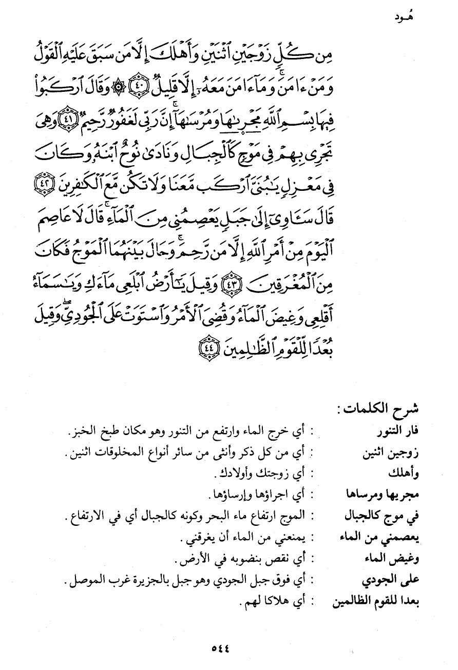 مِن كُلٍّ زَوْجَيْنِ اثْنَيْنِ وَأَهْلَكَ إِلاَّ مَن سَبَقَ عَلَيْهِ الْقَوْلُ وَمَنْ آمَنَ وَمَا آمَنَ مَعَهُ إِلاَّ قَلِيلٌ (40) وَقَالَ ارْكَبُواْ فِيهَا بِسْمِ اللهِ مَجْرَاهَا وَمُرْسَاهَا إِنَّ رَبِّي لَغَفُورٌ رَّحِيمٌ (41) وَهِيَ تَجْرِي بِهِمْ فِي مَوْجٍ كَالْجِبَالِ وَنَادَى نُوحٌ ابْنَهُ وَكَانَ فِي مَعْزِلٍ يَا بُنَيَّ ارْكَب مَّعَنَا وَلاَ تَكُن مَّعَ الْكَافِرِينَ (42) قَالَ سَآوِي إِلَى جَبَلٍ يَعْصِمُنِي مِنَ الْمَاء قَالَ لاَ عَاصِمَ الْيَوْمَ مِنْ أَمْرِ اللهِ إِلاَّ مَن رَّحِمَ وَحَالَ بَيْنَهُمَا الْمَوْجُ فَكَانَ مِنَ الْمُغْرَقِينَ (43) وَقِيلَ يَا أَرْضُ ابْلَعِي مَاءكِ وَيَا سَمَاء أَقْلِعِي وَغِيضَ الْمَاء وَقُضِيَ الأَمْرُ وَاسْتَوَتْ عَلَى الْجُودِيِّ وَقِيلَ بُعْداً لِّلْقَوْمِ الظَّالِمِينَ (44)