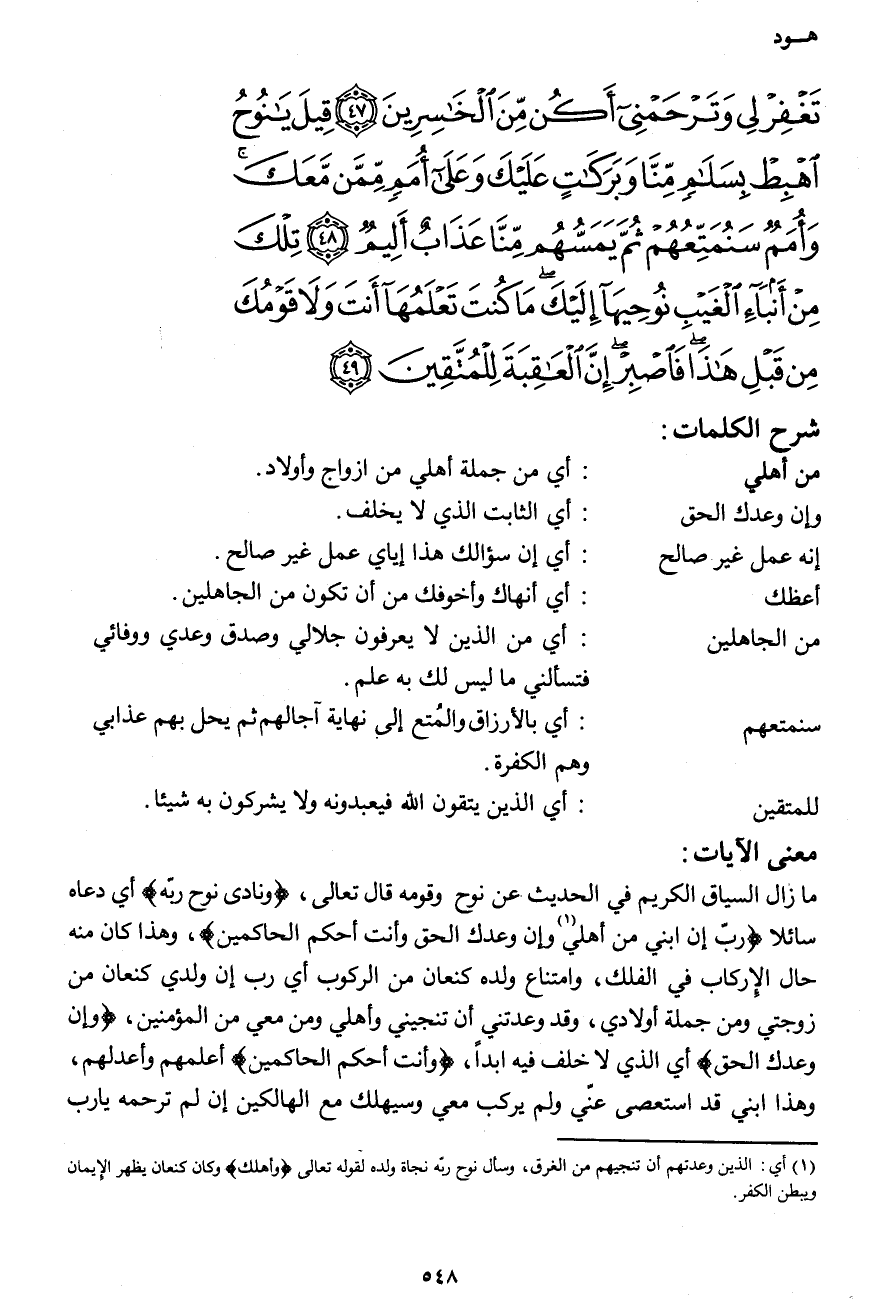 تَغْفِرْ لِي وَتَرْحَمْنِي أَكُن مِّنَ الْخَاسِرِينَ (47) قِيلَ يَا نُوحُ اهْبِطْ بِسَلاَمٍ مِّنَّا وَبَركَاتٍ عَلَيْكَ وَعَلَى أُمَمٍ مِّمَّن مَّعَكَ وَأُمَمٌ سَنُمَتِّعُهُمْ ثُمَّ يَمَسُّهُم مِّنَّا عَذَابٌ أَلِيمٌ (48) تِلْكَ مِنْ أَنبَاء الْغَيْبِ نُوحِيهَا إِلَيْكَ مَا كُنتَ تَعْلَمُهَا أَنتَ وَلاَ قَوْمُكَ مِن قَبْلِ هَذَا فَاصْبِرْ إِنَّ الْعَاقِبَةَ لِلْمُتَّقِينَ (49)
