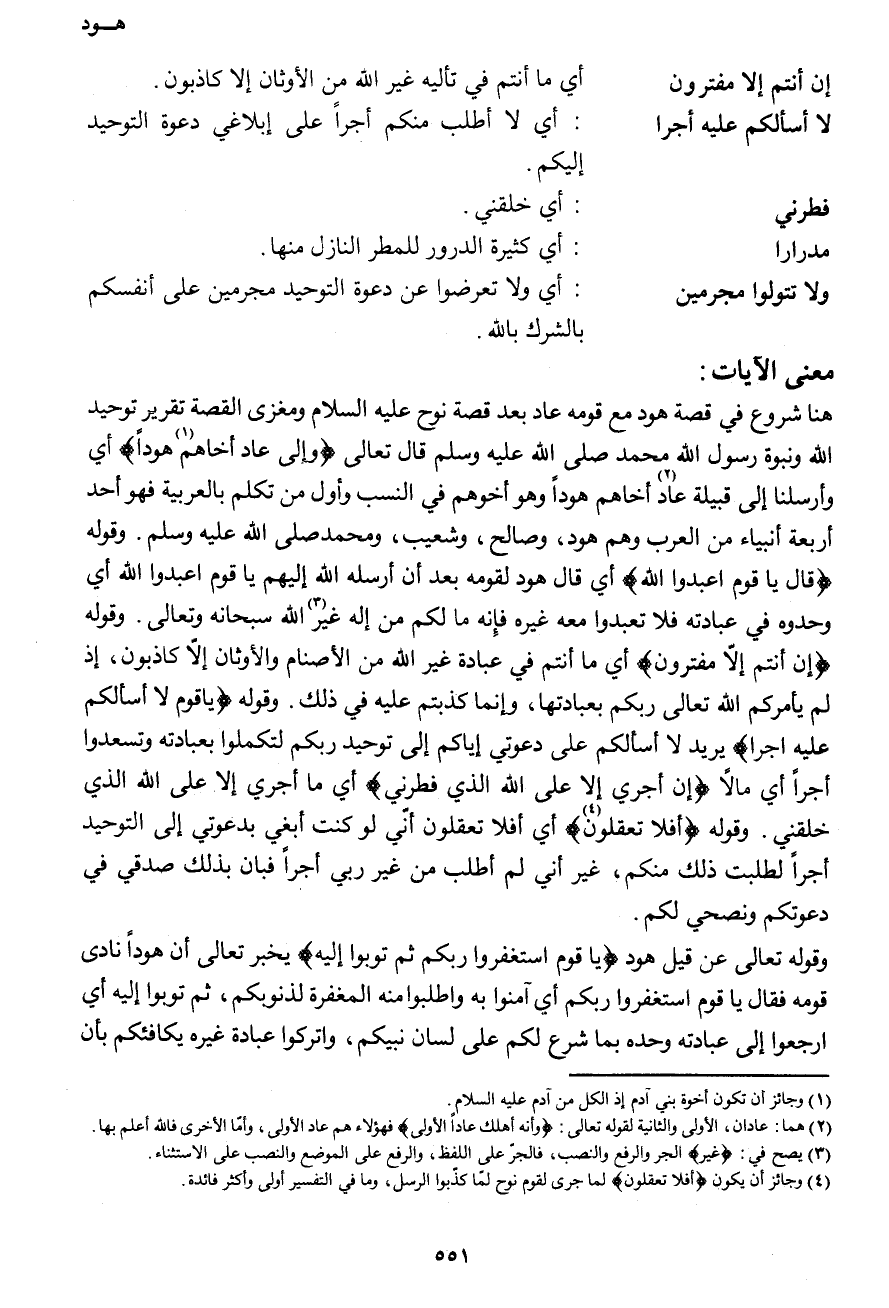 هنا شروع في قصة هود مع قومه عاد بعد قصة نوح عليه السلام ومغزى القصة تقرير توحيد الله ونبوة رسول الله محمد صَلَّى اللهُ عَلَيْهِ وَسَلَّمَ قال تعالى {وإلى عاد أخاهم1 هوداً} أي وأرسلنا إلى قبيلة عاد2 أخاهم هوداً وهو أخوهم في النسب وأول من تكلم بالعربية فهو أحد أربعة أنبياء من العرب وهم هود، وصالح، وشعيب، ومحمد صَلَّى اللهُ عَلَيْهِ وَسَلَّمَ. وقوله {قال يا قوم اعبدوا الله} أي قال هود لقومه بعد أن أرسله الله إليهم يا قوم اعبدوا الله أي وحدوه في عبادته فلا تعبدوا معه غيره فإنه ما لكم من إله غير3 الله سبحانه وتعالى. وقوله {إن أنتم إلا مفترون} أي ما أنتم في عبادة غير الله من الأصنام والأوثان إلا كاذبون، إذ لم يأمركم الله تعالى ربكم بعبادتها، وإنما كذبتم عليه في ذلك. وقوله {يا قوم لا أسألكم عليه أجراً} يريد لا أسألكم على دعوتي إياكم إلى توحيد ربكم لتكملوا بعبادته وتسعدوا أجراً أي مالاً {إن أجرى إلا على الله الذي فطرني} أي ما أجري إلا على الله الذي خلقني. وقوله {أفلا تعقلون4} أي أفلا تعقلون أني لو كنت أبغي بدعوتي إلى التوحيد أجراً لطلبت ذلك منكم، غير أني لم أطلب من غير ربي أجراً فبان بذلك صدقي في دعوتكم ونصحي لكم.