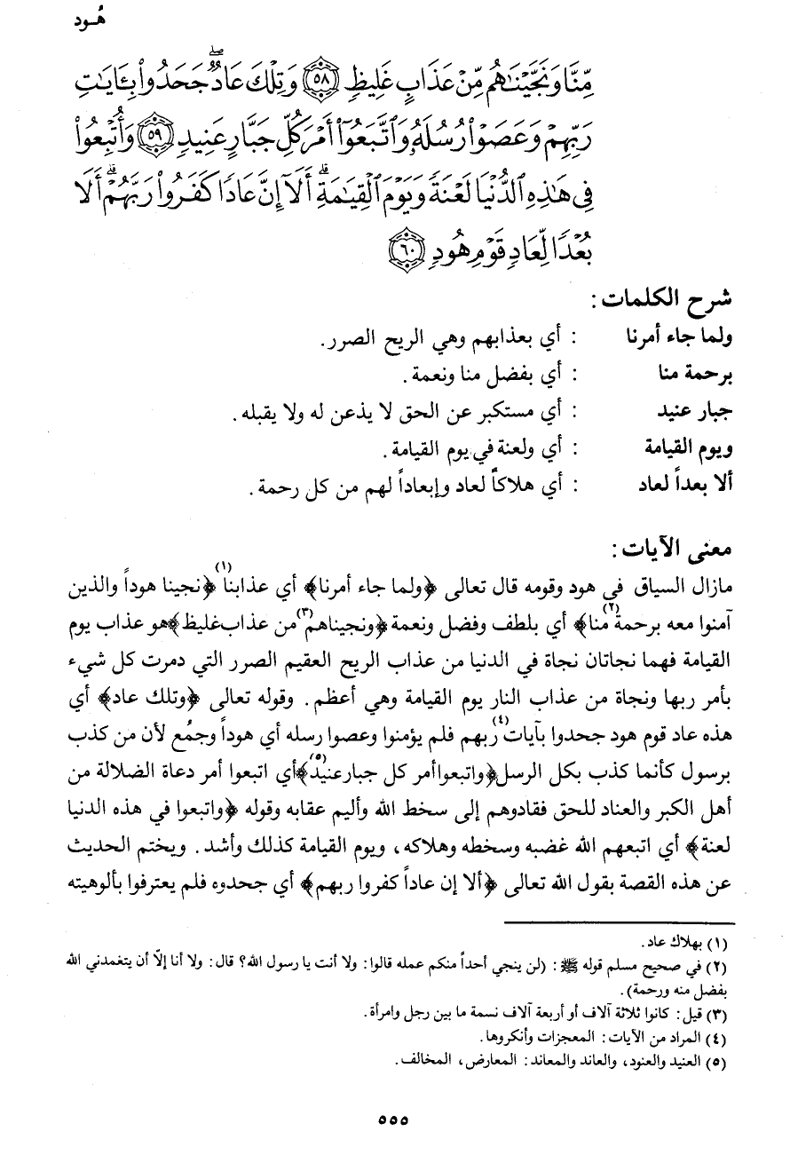 مِّنَّا وَنَجَّيْنَاهُم مِّنْ عَذَابٍ غَلِيظٍ (58) وَتِلْكَ عَادٌ جَحَدُواْ بِآيَاتِ رَبِّهِمْ وَعَصَوْاْ رُسُلَهُ وَاتَّبَعُواْ أَمْرَ كُلِّ جَبَّارٍ عَنِيدٍ (59) وَأُتْبِعُواْ فِي هَذِهِ الدُّنْيَا لَعْنَةً وَيَوْمَ الْقِيَامَةِ أَلا إِنَّ عَادًا كَفَرُواْ رَبَّهُمْ أَلاَ بُعْدًا لِّعَادٍ قَوْمِ هُودٍ (60)