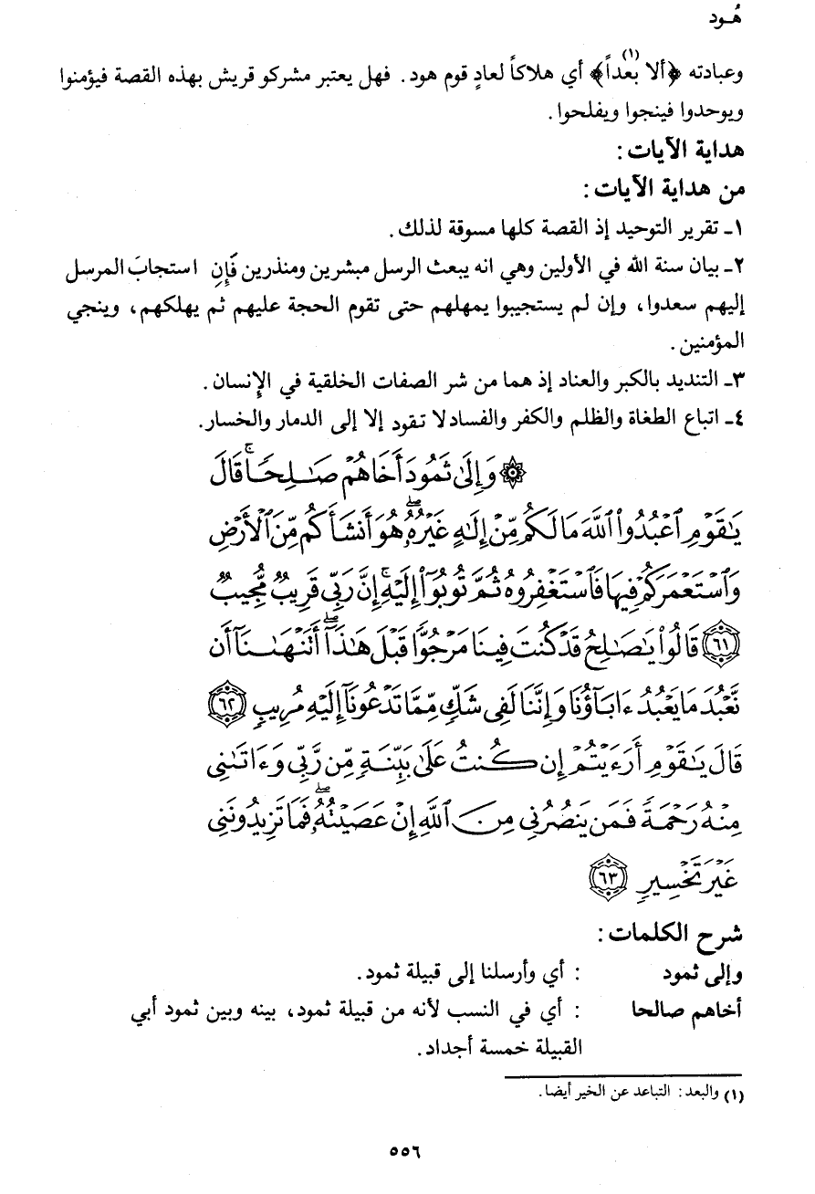 وَإِلَى ثَمُودَ أَخَاهُمْ صَالِحًا قَالَ يَا قَوْمِ اعْبُدُواْ اللهَ مَا لَكُم مِّنْ إِلَهٍ غَيْرُهُ هُوَ أَنشَأَكُم مِّنَ الأَرْضِ وَاسْتَعْمَرَكُمْ فِيهَا فَاسْتَغْفِرُوهُ ثُمَّ تُوبُواْ إِلَيْهِ إِنَّ رَبِّي قَرِيبٌ مُّجِيبٌ (61) قَالُواْ يَا صَالِحُ قَدْ كُنتَ فِينَا مَرْجُوًّا قَبْلَ هَذَا أَتَنْهَانَا أَن نَّعْبُدَ مَا يَعْبُدُ آبَاؤُنَا وَإِنَّنَا لَفِي شَكٍّ مِّمَّا تَدْعُونَا إِلَيْهِ مُرِيبٍ (62) قَالَ يَا قَوْمِ أَرَأَيْتُمْ إِن كُنتُ عَلَى بَيِّنَةً مِّن رَّبِّي وَآتَانِي مِنْهُ رَحْمَةً فَمَن يَنصُرُنِي مِنَ اللهِ إِنْ عَصَيْتُهُ فَمَا تَزِيدُونَنِي غَيْرَ تَخْسِيرٍ (63)