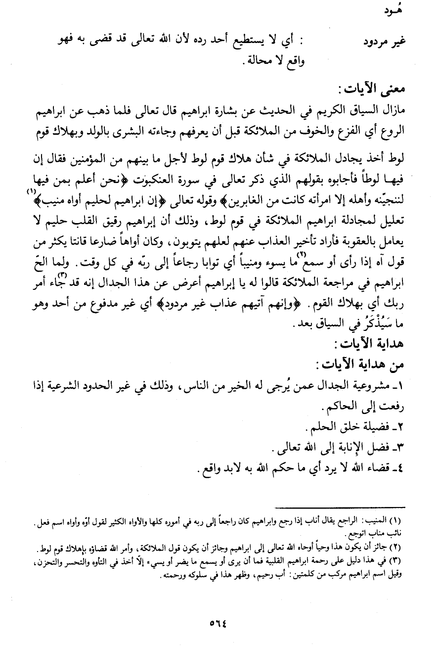 مازال السياق الكريم في الحديث عن بشارة إبراهيم قال تعالى فلما ذهب عن إبراهيم الروع أي الفزع والخوف من الملائكة قبل أن يعرفهم وجاءته البشرى بالولد وبهلاك قوم لوط أخذ يجادل الملائكة في شأن هلاك قوم لوط لأجل ما بينهم من المؤمنين فقال إن فيها لوطاً فأجابوه بقولهم الذي ذكر تعالى في سورة العنكبوت {نحن أعلم بمن فيها لننجيّنه وأهله إلا امرأته كانت من الغابرين} وقوله تعالى {إن إبراهيم لحليم أواه منيب} 1 تعليل لمجادلة إبراهيم الملائكة في قوم لوط، وذلك أن إبراهيم رقيق القلب حليم لا يعامل بالعقوبة فأراد تأخير العذاب عنهم لعلهم يتوبون، وكان أواهاً ضارعا قانتا يكثر من قول آه إذا رأى أو سمع2 ما يسوء ومنيباً أي توابا رجاعاً إلى ربّه في كل وقت. ولما الحّ إبراهيم في مراجعة الملائكة قالوا له يا إبراهيم أعرض عن هذا الجدال إنه قد جاء3 أمر ربك أي بهلاك القوم. {وإنهم آتيهم عذاب غير مردود} أي غير مدفوع من أحد وهو ما سَيُذْكَرُ في السياق بعد.