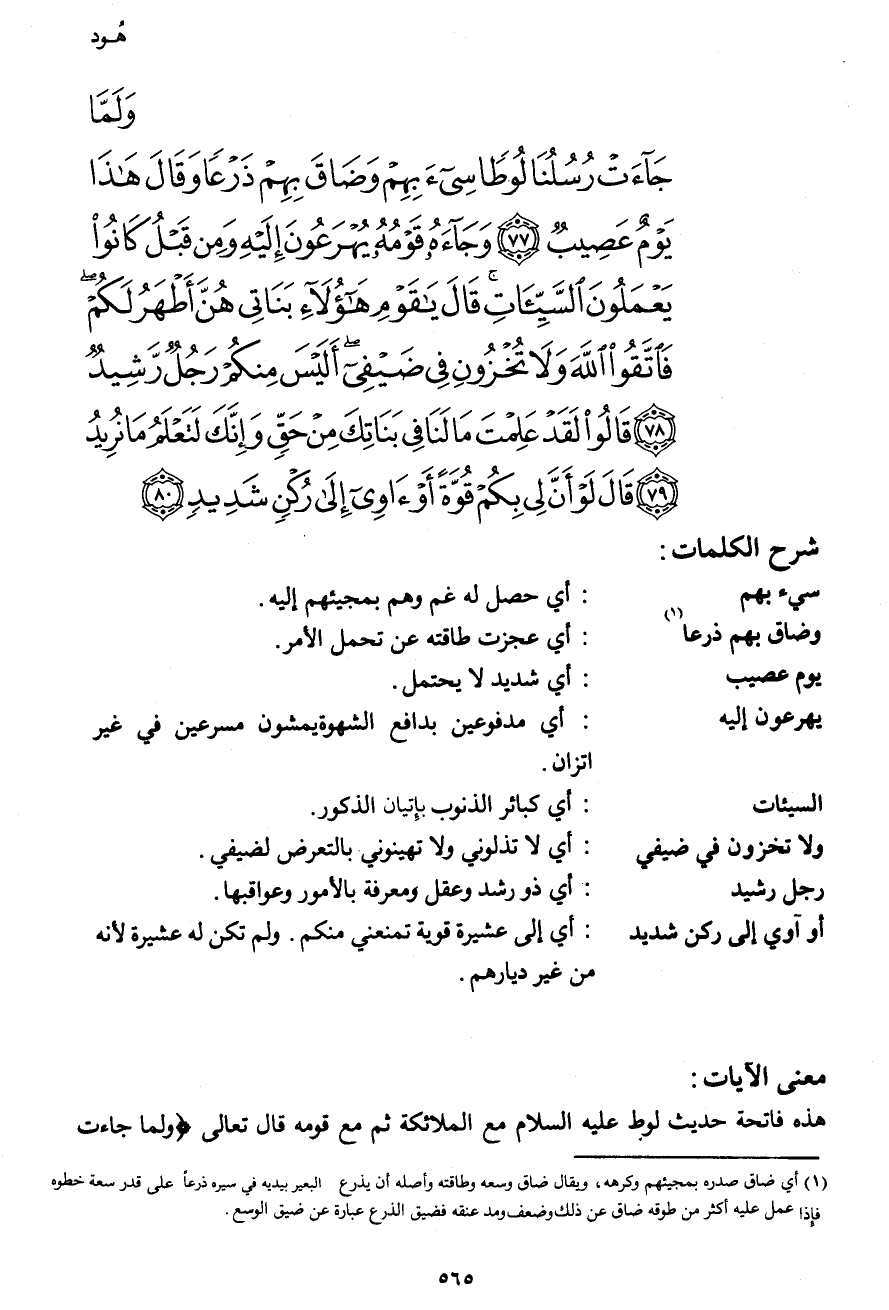وَلَمَّا جَاءتْ رُسُلُنَا لُوطًا سِيءَ بِهِمْ وَضَاقَ بِهِمْ ذَرْعًا وَقَالَ هَذَا يَوْمٌ عَصِيبٌ (77) وَجَاءهُ قَوْمُهُ يُهْرَعُونَ إِلَيْهِ وَمِن قَبْلُ كَانُواْ يَعْمَلُونَ السَّيِّئَاتِ قَالَ يَا قَوْمِ هَؤُلاء بَنَاتِي هُنَّ أَطْهَرُ لَكُمْ فَاتَّقُواْ اللهَ وَلاَ تُخْزُونِ فِي ضَيْفِي أَلَيْسَ مِنكُمْ رَجُلٌ رَّشِيدٌ (78) قَالُواْ لَقَدْ عَلِمْتَ مَا لَنَا فِي بَنَاتِكَ مِنْ حَقٍّ وَإِنَّكَ لَتَعْلَمُ مَا نُرِيدُ (79) قَالَ لَوْ أَنَّ لِي بِكُمْ قُوَّةً أَوْ آوِي إِلَى رُكْنٍ شَدِيدٍ (80)