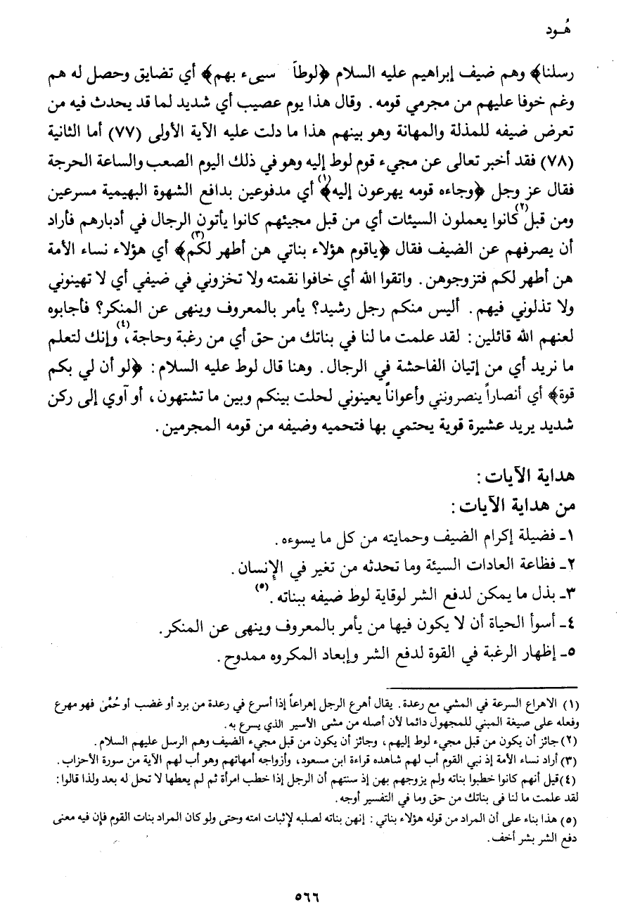رسلنا} وهم ضيف إبراهيم عليه السلام {لوطاً سيىء بهم} أي تضايق وحصل له هم وغم خوفا عليهم من مجرمي قومه. وقال هذا يوم عصيب أي شديد لما قد يحدث فيه من تعرض ضيفه للمذلة والمهانة وهو بينهم هذا ما دلت عليه الآية الأولى (77) أما الثانية (78) فقد أخبر تعالى عن مجيء قوم لوط إليه وهو في ذلك اليوم الصعب والساعة الحرجة فقال عز وجل {وجاءه قومه يهرعون إليه1} أي مدفوعين بدافع الشهوة البهيمية مسرعين ومن قبل2 كانوا يعملون السيئات أي من قبل مجيئهم كانوا يأتون الرجال في أدبارهم فأراد أن يصرفهم عن الضيف فقال {يا قوم هؤلاء بناتي هن أطهر لكم3} أي هؤلاء نساء الأمة هن أطهر لكم فتزوجوهن. واتقوا الله أي خافوا نقمته ولا تخزوني في ضيفي أي لا تهينوني ولا تذلوني فيهم. أليس منكم رجل رشيد؟ يأمر بالمعروف وينهى عن المنكر؟ فأجابوه لعنهم الله قائلين: لقد علمت ما لنا في بناتك من حق أي من رغبة وحاجة4، وإنك لتعلم ما نريد أي من إتيان الفاحشة في الرجال. وهنا قال لوط عليه السلام: {لو أن لي بكم قوة} أي أنصاراً ينصرونني وأعواناً يعينوني لحلت بينكم وبين ما تشتهون، أو آوي إلى ركن شديد يريد عشيرة قوية يحتمي بها فتحميه وضيفه من قومه المجرمين.