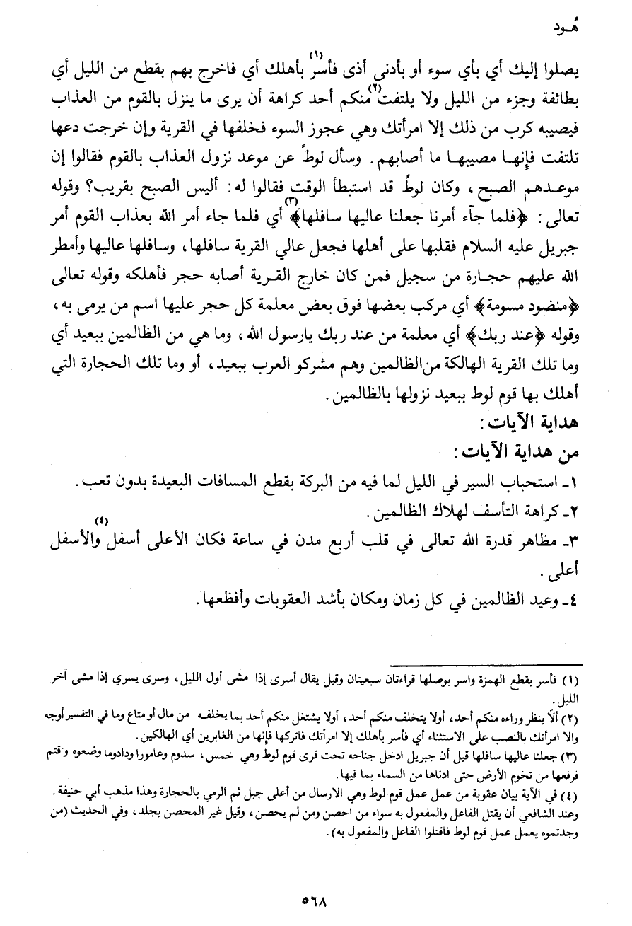 2 ألاّ ينظر وراءه منكم أحد، أو لا يتخلف منكم أحد، أو لا يشتغل منكم أحد بما يخلفه من مال أو متاع وما في التفسير أوجه وإلا امرأتك بالنصب على الاستثناء أي فأسر بأهلك إلا امرأتك فاتركها فإنها من الغابرين أي الهالكين.