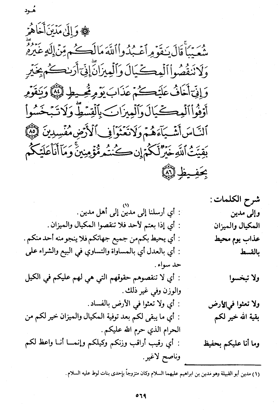 وَإِلَى مَدْيَنَ أَخَاهُمْ شُعَيْبًا قَالَ يَا قَوْمِ اعْبُدُواْ اللهَ مَا لَكُم مِّنْ إِلَهٍ غَيْرُهُ وَلاَ تَنقُصُواْ الْمِكْيَالَ وَالْمِيزَانَ إِنِّيَ أَرَاكُم بِخَيْرٍ وَإِنِّيَ أَخَافُ عَلَيْكُمْ عَذَابَ يَوْمٍ مُّحِيطٍ (84) وَيَا قَوْمِ أَوْفُواْ الْمِكْيَالَ وَالْمِيزَانَ بِالْقِسْطِ وَلاَ تَبْخَسُواْ النَّاسَ أَشْيَاءهُمْ وَلاَ تَعْثَوْاْ فِي الأَرْضِ مُفْسِدِينَ (85) بَقِيَّةُ اللهِ خَيْرٌ لَّكُمْ إِن كُنتُم مُّؤْمِنِينَ وَمَا أَنَاْ عَلَيْكُم بِحَفِيظٍ (86)