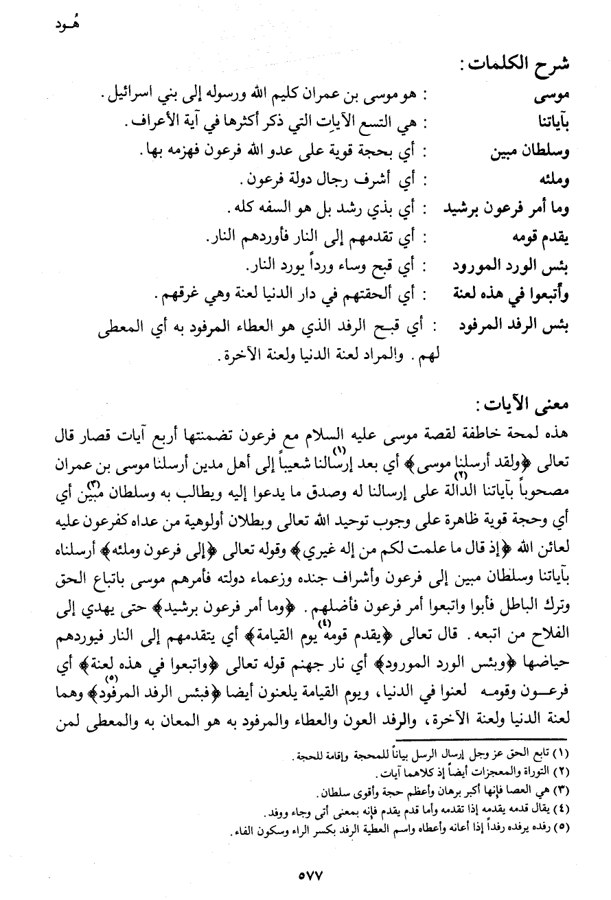 هذه لمحة خاطفة لقصة موسى عليه السلام مع فرعون تضمنتها أربع آيات قصار قال تعالى {ولقد أرسلنا موسى} أي بعد إرسالنا1 شعيباً إلى أهل مدين أرسلنا موسى بن عمران مصحوباً بآياتنا الدالة2 على إرسالنا له وصدق ما يدعوا إليه ويطالب به وسلطان مبين3 أي وحجة قوية ظاهرة على وجوب توحيد الله تعالى وبطلان أولوهية من عداه كفرعون عليه لعائن الله {إذ قال ما علمت لكم من إله غيري} وقوله تعالى {إلى فرعون وملئه} أرسلناه بآياتنا وسلطان مبين إلى فرعون وأشراف جنده وزعماء دولته فأمرهم موسى بإتباع الحق وترك الباطل فأبوا واتبعوا أمر فرعون فأضلهم. {وما أمر فرعون برشيد} حتى يهدي إلى الفلاح من اتبعه. قال تعالى (يقدم قومه4 يوم القيامة} أي لتقدمهم إلى النار فيوردهم حياضها {وبئس الورد المورود} أي نار جهنم قوله تعالى {واتبعوا في هذه لعنة} أي فرعون وقومه لعنوا في الدنيا، ويوم القيامة يلعنون أيضاً {فبئس الرفد المرفود5} وهما لعنة الدنيا ولعنة الآخرة، والرفد العون والعطاء والمرفود به هو المعان به والمعطى لمن