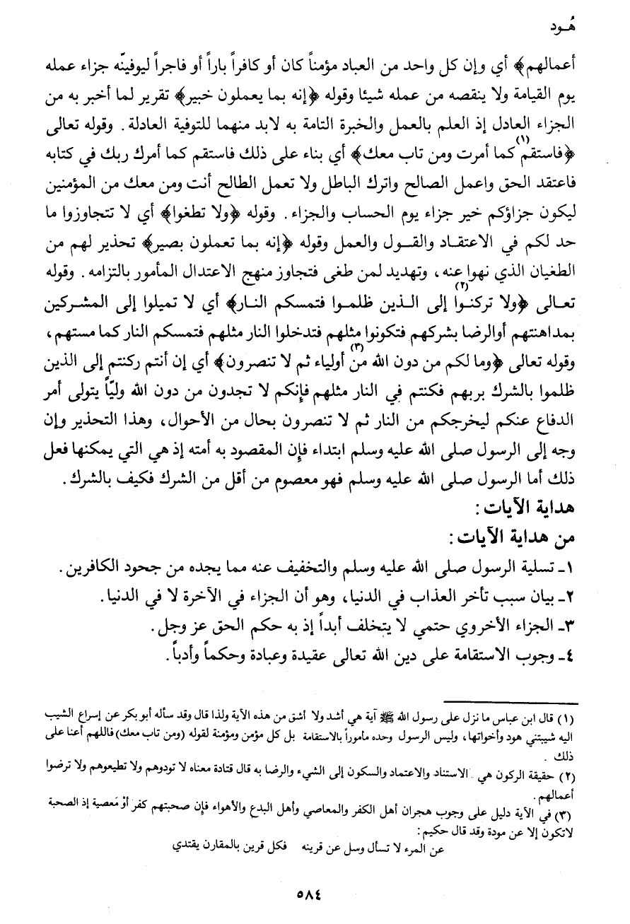 أعمالهم} أي وان كل واحد من العباد مؤمناً كان أو كافراً باراً أو فاجراً ليوفيّنه جزاء عمله يوم القيامة ولا ينقصه من عمله شيئاً وقوله {إنه بما يعملون خبير} تقرير لما أخبر به من الجزاء العادل إذ العلم بالعمل والخبرة التامة به لابد منهما للتوفية العادلة. وقوله تعالى {فاستقم1 كما أمرت ومن تاب معك} أي بناء على ذلك فاستقم كما أمرك ربك في كتابه فاعتقد الحق واعمل الصالح واترك الباطل ولا تعمل الطالح أنت ومن معك من المؤمنين لكون جزاؤكم خير جزاء يوم الحساب والجزاء. وقوله {ولا تطغوا} أي لا تتجاوزوا ما حد لكم في الاعتقاد والقول والعمل وقوله {إنه بما تعملون بصير} تحذير لهم من الطغيان الذي نهوا عنه، وتهديد لمن طغى فتجاوز منهج الاعتدال المأمور بالتزامه. وقوله تعالى {ولا تركنوا2 إلى الذين ظلموا فتمسكم النار} أي لا تميلوا إلى المشركين بمداهنتهم أو الرضا بشركهم فتكونوا مثلهم فتدخلوا النار مثلهم فتمسكم النار كما مستهم، وقوله تعالى {وما لكم من دون الله من3 أولياء ثم لا تنصرون} أي إن أنتم ركنتم إلى الذين ظلموا بالشرك بربهم فكنتم في النار مثلهم فإنكم لا تجدون من دون الله وليّاً يتولى أمر الدفاع عنكم ليخرجكم من النار ثم لا تنصرون بحال من الأحوال، وهذا التحذير وإن وجه إلى الرسول صَلَّى اللهُ عَلَيْهِ وَسَلَّمَ ابتداء فإن المقصود به أمته إذ هي التي يمكنها فعل ذلك أما الرسول صَلَّى اللهُ عَلَيْهِ وَسَلَّمَ فهو معصوم من أقل من الشرك فكيف بالشرك.