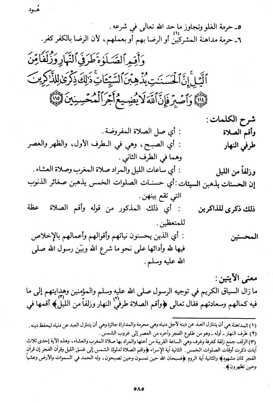 وَأَقِمِ الصَّلاَةَ طَرَفَيِ النَّهَارِ وَزُلَفًا مِّنَ اللَّيْلِ إِنَّ الْحَسَنَاتِ يُذْهِبْنَ السَّيِّئَاتِ ذَلِكَ ذِكْرَى لِلذَّاكِرِينَ (114) وَاصْبِرْ فَإِنَّ اللهَ لاَ يُضِيعُ أَجْرَ الْمُحْسِنِينَ (115)