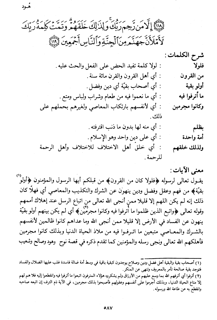 (118) إِلاَّ مَن رَّحِمَ رَبُّكَ وَلِذَلِكَ خَلَقَهُمْ وَتَمَّتْ كَلِمَةُ رَبِّكَ لأَمْلأنَّ جَهَنَّمَ مِنَ الْجِنَّةِ وَالنَّاسِ أَجْمَعِينَ (119)