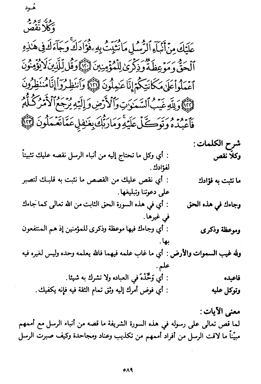 وَكُلاًّ نَّقُصُّ عَلَيْكَ مِنْ أَنبَاء الرُّسُلِ مَا نُثَبِّتُ بِهِ فُؤَادَكَ وَجَاءكَ فِي هَذِهِ الْحَقُّ وَمَوْعِظَةٌ وَذِكْرَى لِلْمُؤْمِنِينَ (120) وَقُل لِّلَّذِينَ لاَ يُؤْمِنُونَ اعْمَلُواْ عَلَى مَكَانَتِكُمْ إِنَّا عَامِلُونَ (121) وَانتَظِرُوا إِنَّا مُنتَظِرُونَ (122) وَلِلّهِ غَيْبُ السَّمَاوَاتِ وَالأَرْضِ وَإِلَيْهِ يُرْجَعُ الأَمْرُ كُلُّهُ فَاعْبُدْهُ وَتَوَكَّلْ عَلَيْهِ وَمَا رَبُّكَ بِغَافِلٍ عَمَّا تَعْمَلُونَ (123)