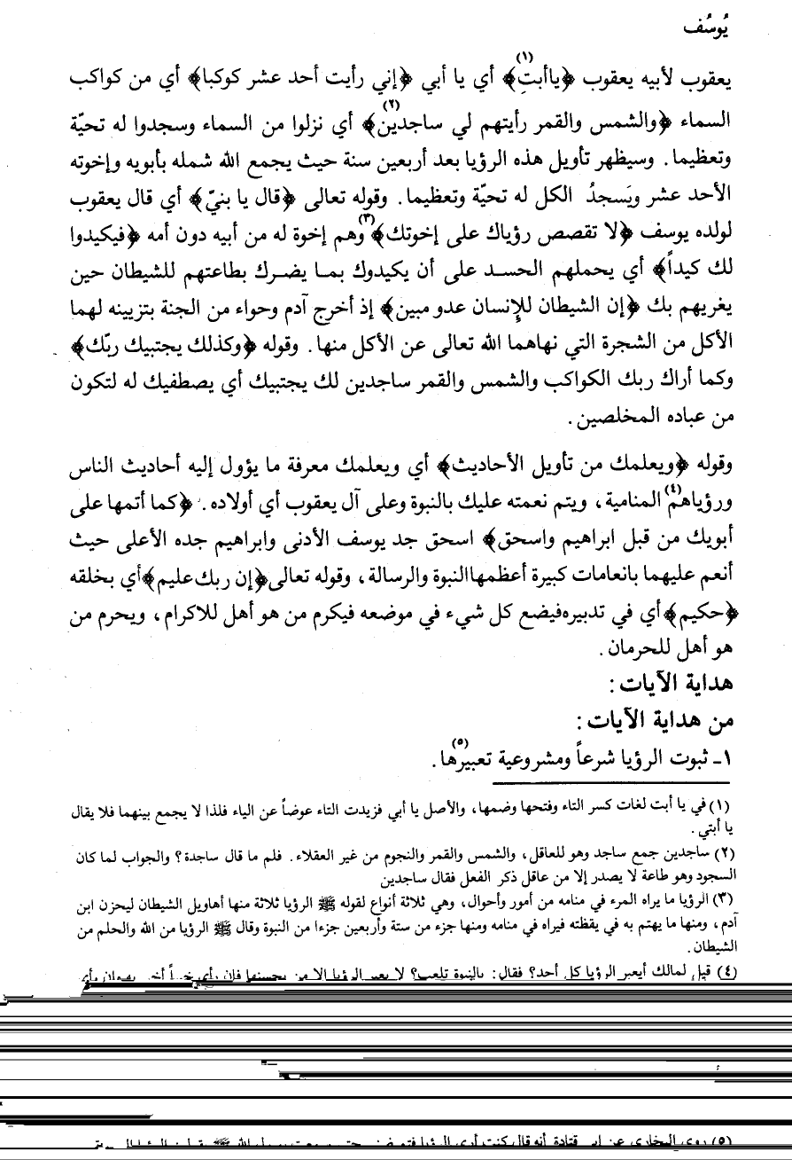 يعقوب لأبيه يعقوب {يا أبتِ1} أي يا أبى {إني رأيت أحد عشر كوكباً} أي من كواكب السماء {والشمس والقمر رأيتهم لي ساجدين2} أي نزلوا من السماء وسجدوا له تحيّة وتعظيماً. وسيظهر تأويل هذه الرؤيا بعد أربعين سنة حيث يجمع الله شمله بأبويه وإخوته الأحد عشر ويَسجدُ الكل له تحيّة وتعظيماًَ. وقوله تعالى {قال يا بنيّ} أي قال يعقوب لولده يوسف {لا تقصص رؤياك على إخوتك} 3 وهم إخوة له من أبيه دون أمه {فيكيدوا لك كيداً} أي يحملهم الحسد على أن يكيدوك بما يضرك بطاعتهم للشيطان حين يغريهم بك {إن الشيطان للإنسان عدو مبين} إذ أخرج آدم وحواء من الجنة بتزيينه لهما الأكل من الشجرة التي نهاهما الله تعالى عن الأكل منها. وقوله {وكذلك يجتبيك ربّك} وكما أراك ربك الكواكب والشمس والقمر ساجدين لك يجتبيك أي يصطفيك له لتكون من عباده المخلصين.