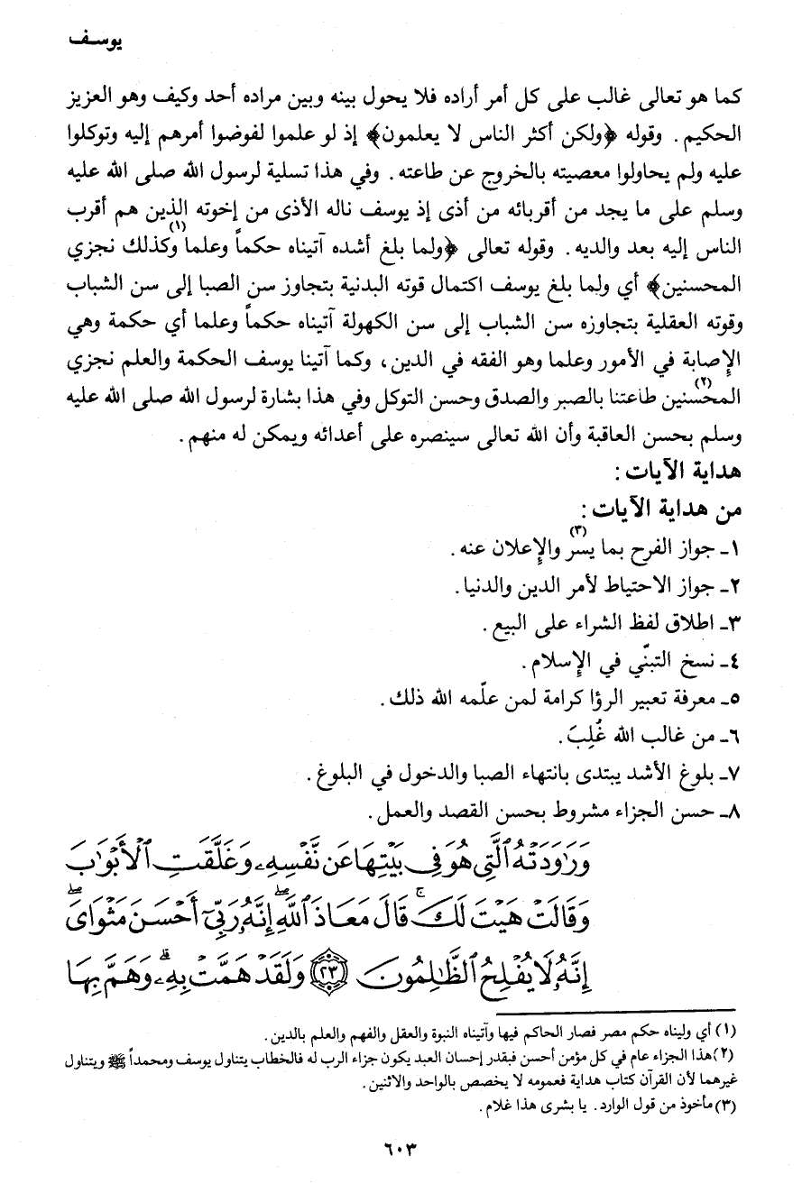 وَرَاوَدَتْهُ الَّتِي هُوَ فِي بَيْتِهَا عَن نَّفْسِهِ وَغَلَّقَتِ الأَبْوَابَ وَقَالَتْ هَيْتَ لَكَ قَالَ مَعَاذَ اللهِ إِنَّهُ رَبِّي أَحْسَنَ مَثْوَايَ إِنَّهُ لاَ يُفْلِحُ الظَّالِمُونَ (23) وَلَقَدْ هَمَّتْ بِهِ وَهَمَّ بِهَا